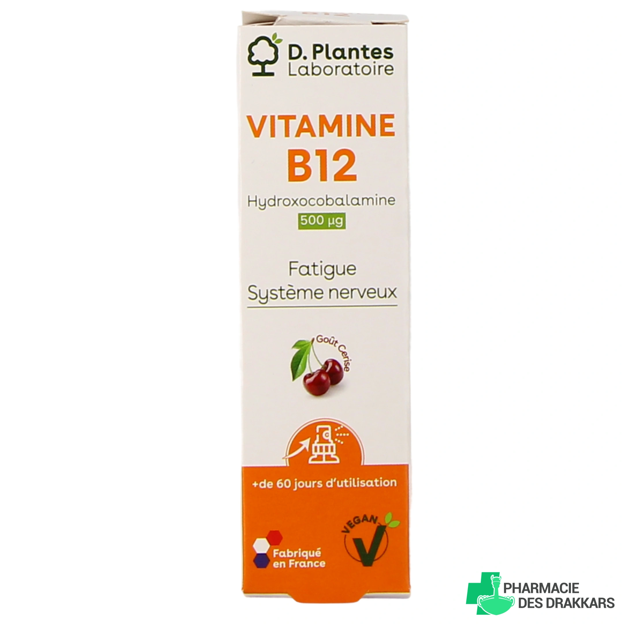Ce complément alimentaire D Plantes apporte 500 µg de vitamine B12 par dose journalière et propose un bon goût de cerise grâce à un arôme naturel.