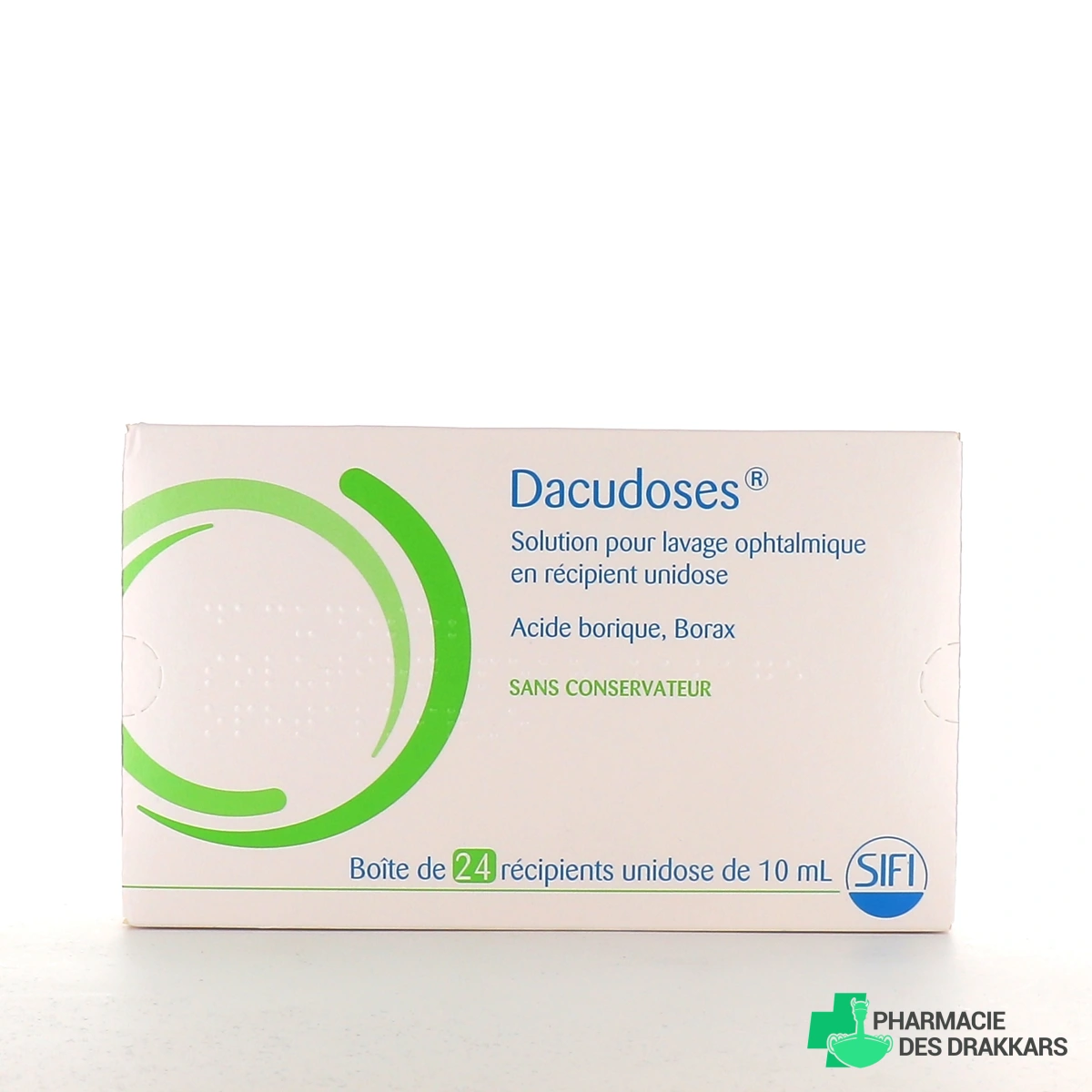 Les doses de solution pour lavage oculaire Dacudoses sont réservées à un usage par voie ophtalmique. Vous pouvez effectuer de 1 à 4 lavages oculaires par jour selon les besoins avec Dacudoses.
