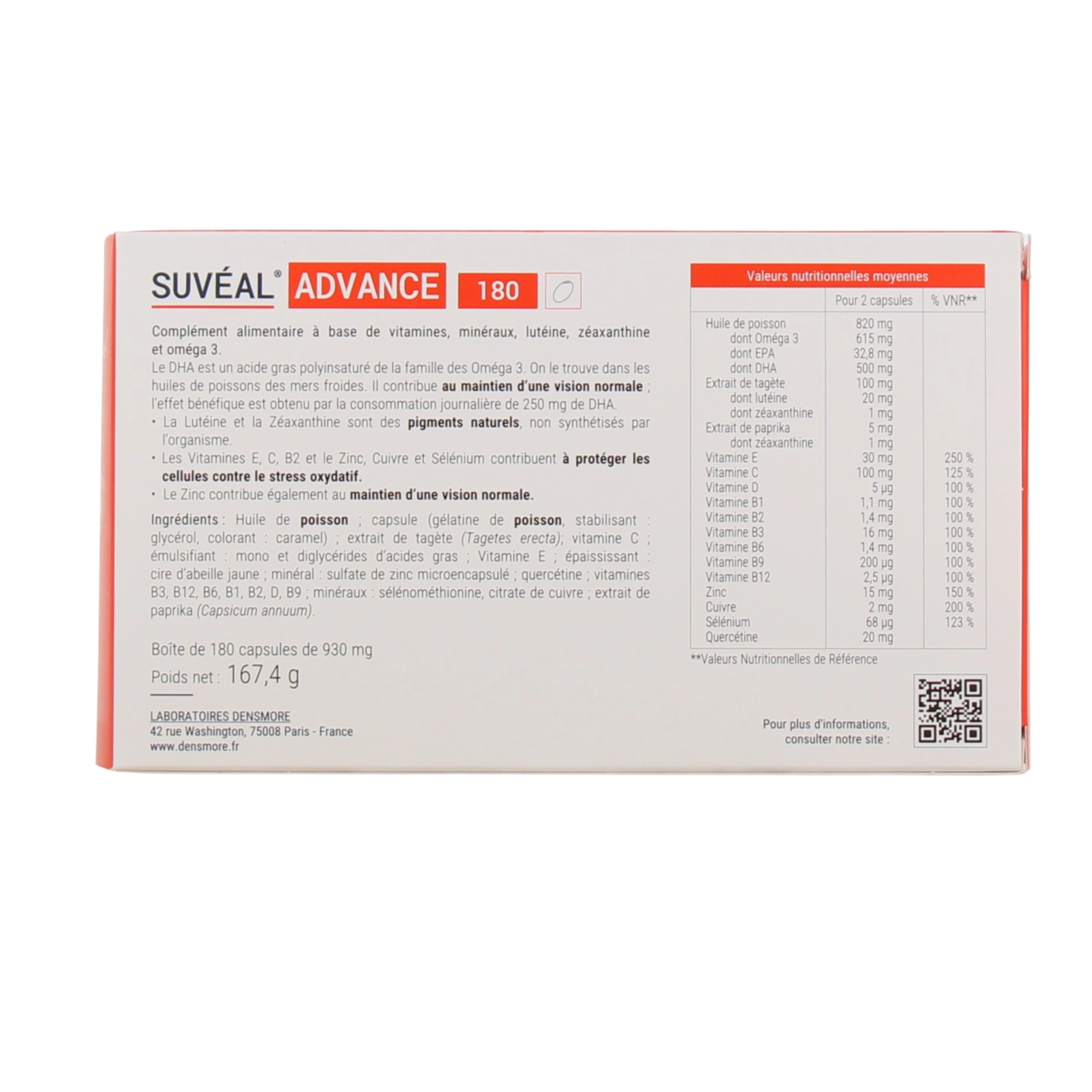 Suvéal Advance est un complément alimentaire à base de vitamines, de minéraux, de lutéine, de zéaxanthine et d'oméga 3 pour le maintien d'une vision normale. Formulé par les laboratoires Densmore, il se présente sous la forme de capsules.