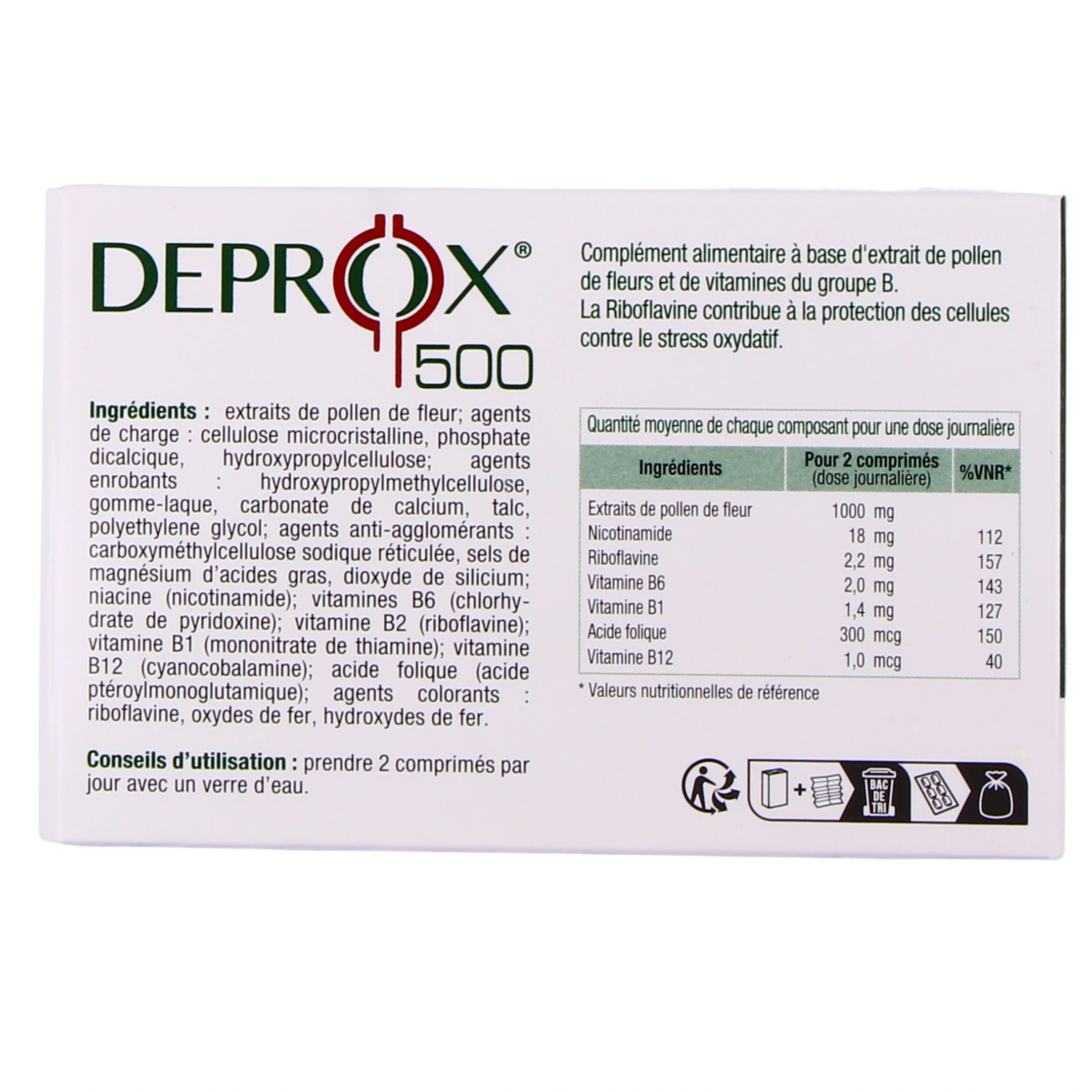 Deprox 500 est un complément alimentaire à base d'extraits de pollen de fleurs et de vitamines du groupe B qui permet une action systémique. Il est composé d'un extrait standardisé de pollen de seigle (Secale cereal), maïs (Zea mays) et fléole des prés (Phleum pratense), associé aux vitamines B1, B2, B3, B6, B9 et B12.