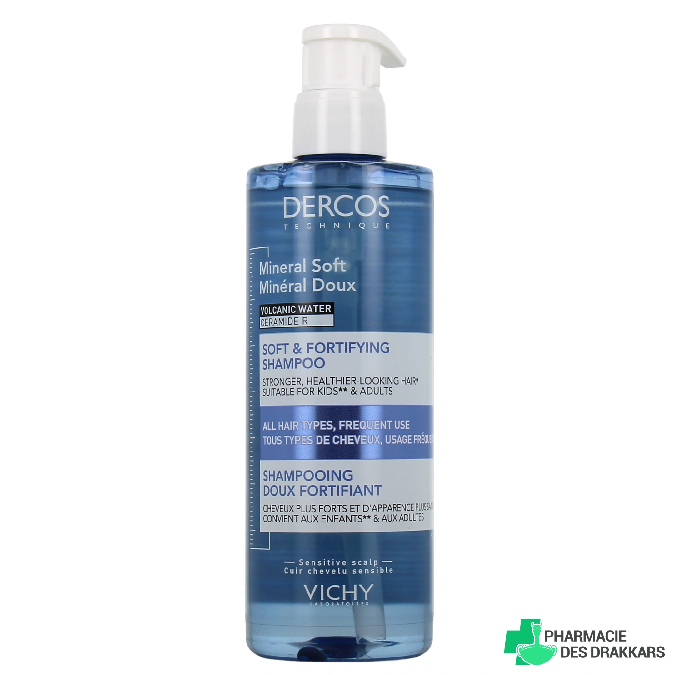 Le shampooing minéral doux fortifiant Dercos des Laboratoires Vichy lave la chevelure en douceur de toute la famille même celle des enfants et rend les cheveux plus forts et plus brillants de la racine jusqu'aux pointes. Tous les types de cheveux peuvent l'utiliser, qu'ils soient secs, normaux ou à tendance grasse.