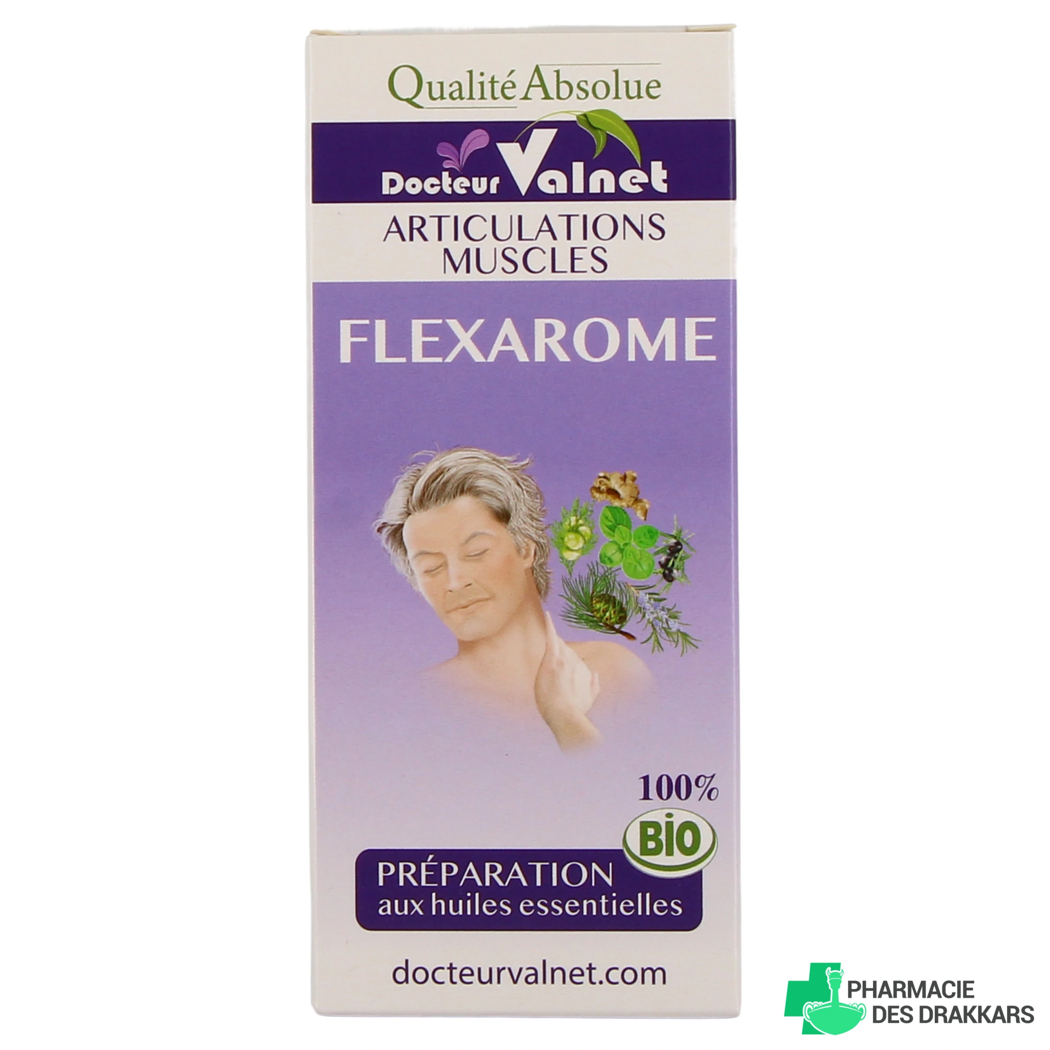 Flexarome est une préparation formulée à 100% d'ingrédients issus de l'Agriculture Biologique et expérimentée par le Docteur Valnet. Elle se compose d'huiles essentielles Bio telles que térébenthine, origan, baie de genièvre, cyprès, romarin et teinture de gingembre. Ces huiles essentielles offrent un soulagement en cas d'articulations sensibles et de contractures musculaires; les bienfaits sont immédiats.