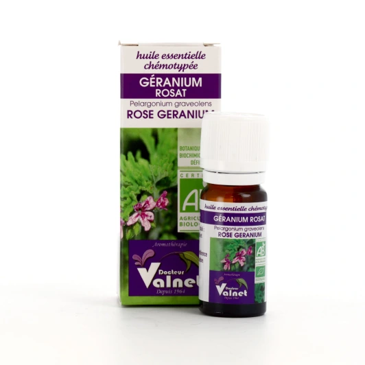 L'huile essentielle de Géranium Rosat Docteur Valnet est pure, naturelle et Bio. Elle est traditionnellement réputée pour agir sur les problèmes cutanés.