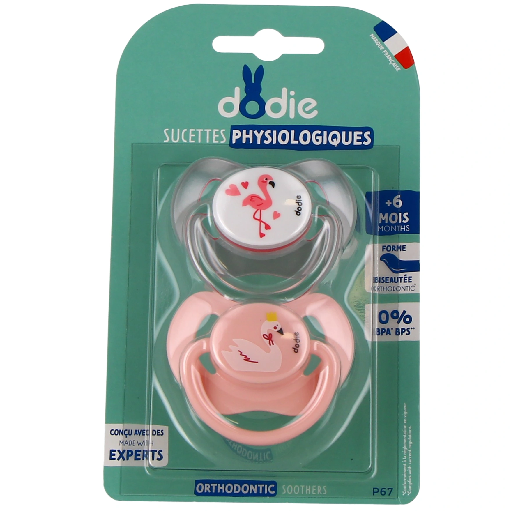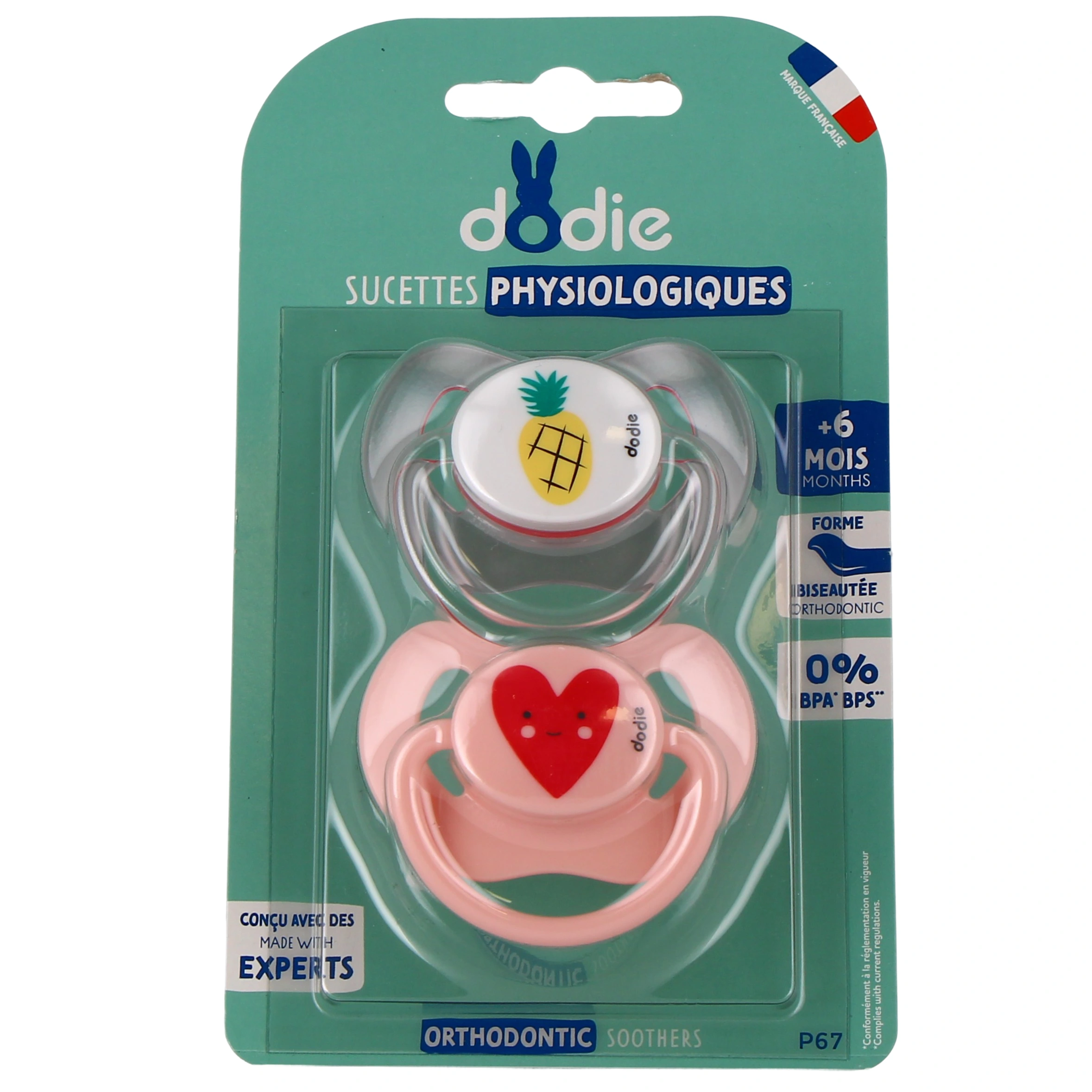 - La sucette physiologique +6 mois Dodie se caractérise par sa forme asymétrique. Elle est plate contre la langue puis bombée et arrondie pour se loger parfaitement au niveau du palais. Ainsi, la sucette physiologique favorise un bon positionnement de la langue et participe à un développement bucco-dentaire optimal. Pour les bébés allaités, elle éviterait la confusion sein-tétine. En effet, sa forme est semblable à celle du mamelon lors de la tétée.