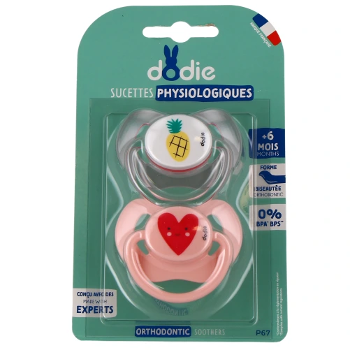 - Dodie propose également la sucette +6 mois Dodie Extra. Il s'agit d'une sucette anatomique extra fine, souple, aérée et légère. Elle est optimisée pour offrir une succion plus naturelle et minimiser les risques de déformation du palais, d'irritations péri-orales, de pression sur le visage, la bouche et la mâchoire.