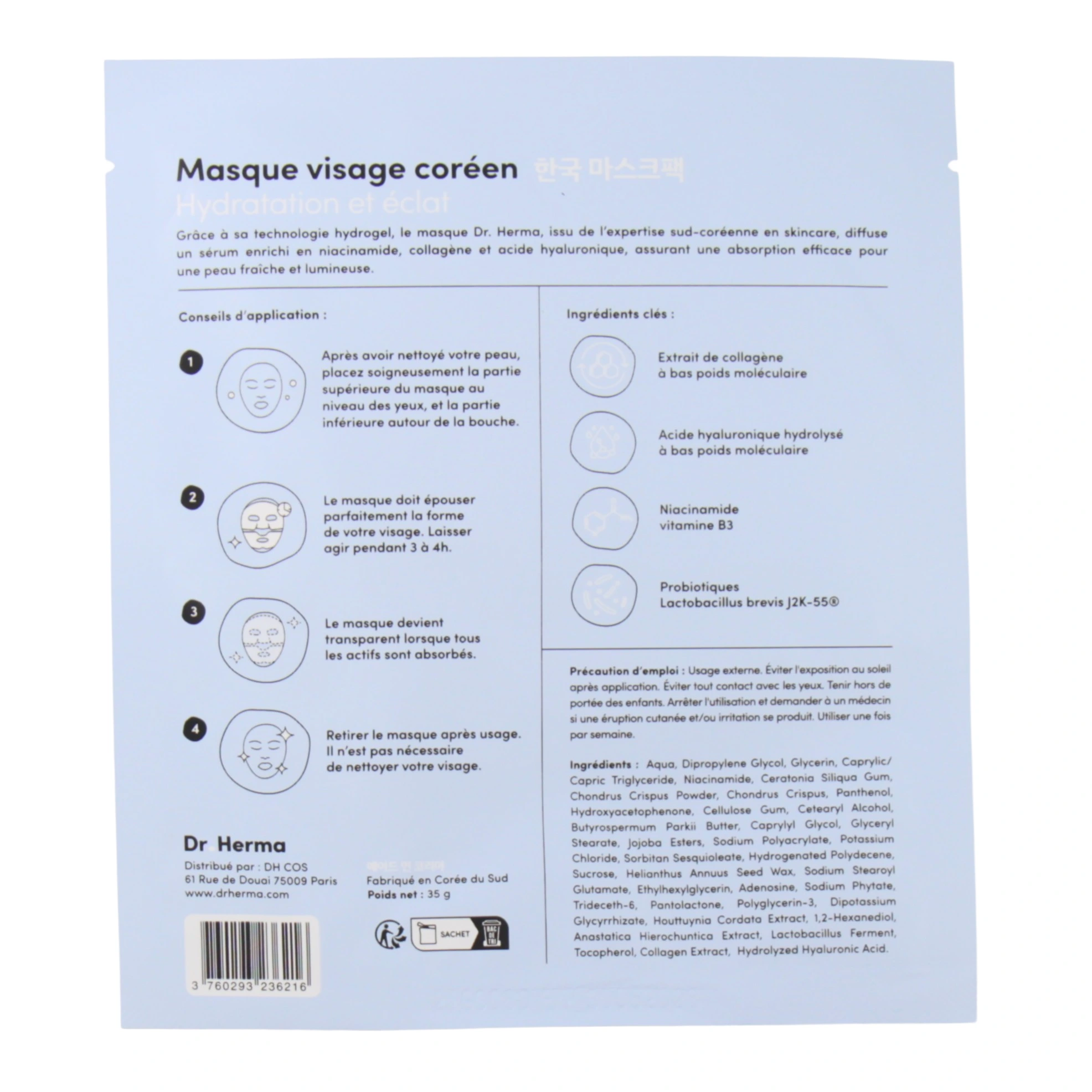 Le masque hydrogel formulé par la marque Dr Herma est soin pour le visage qui contient du niacinamide, du collagène, de l'acide hyaluronique ainsi que des probiotiques pour hydrater, illuminer et raffermir la peau. Il offre un moment de bien-être inspiré de la routine de soins coréenne ainsi qu'une peau fraîche et lumineuse.