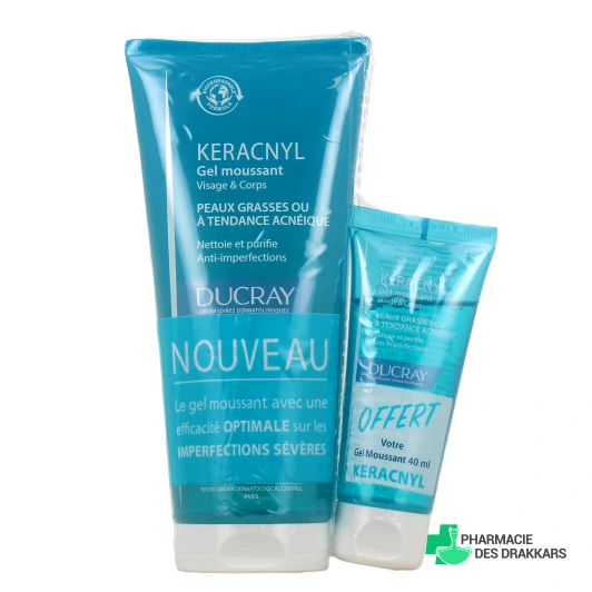 Testé sous contrôle dermatologique, le gel moussant Keracnyl Ducray convient aussi bien sur le visage que sur le corps. Il peut être utilisé seul ou en association avec un traitement anti-acné.