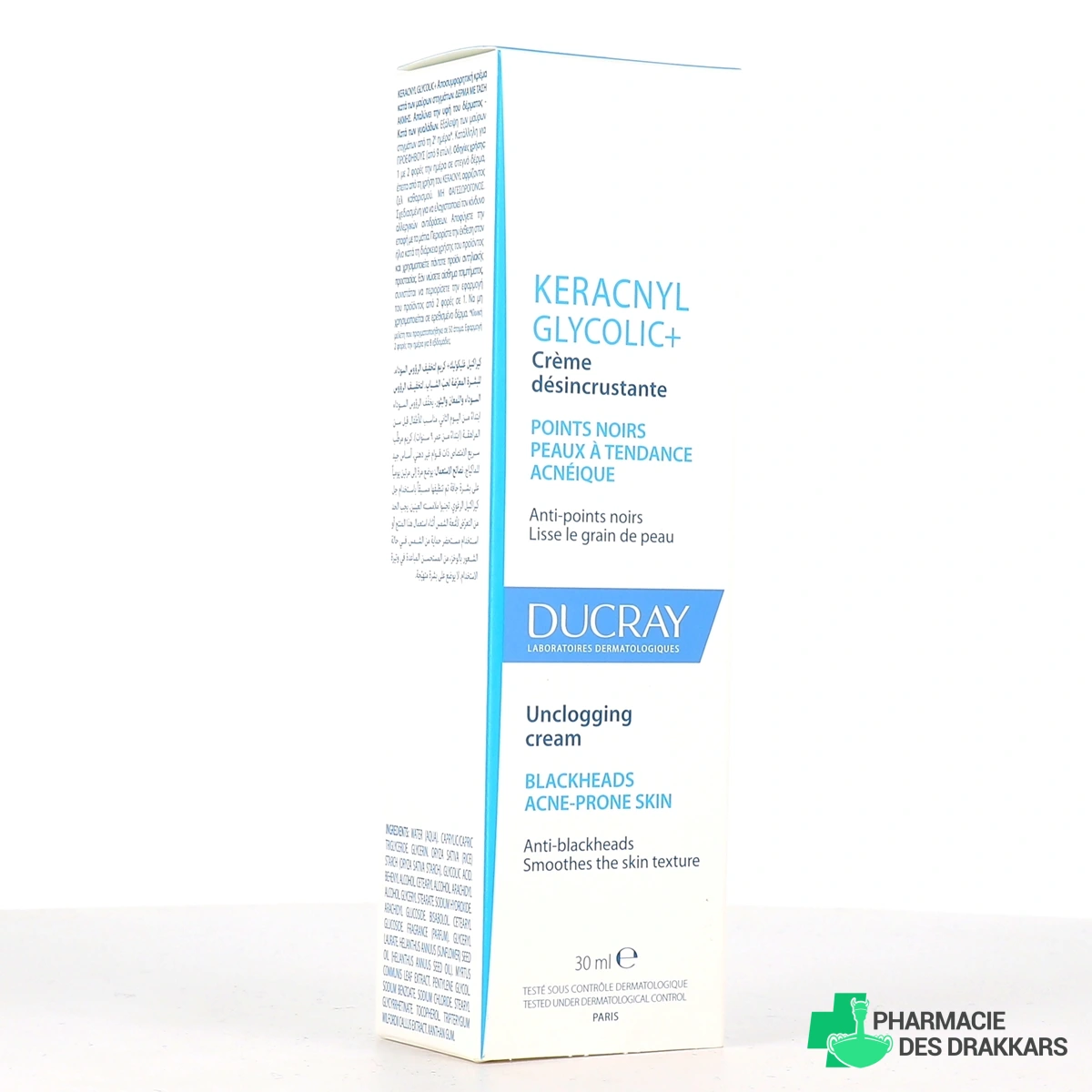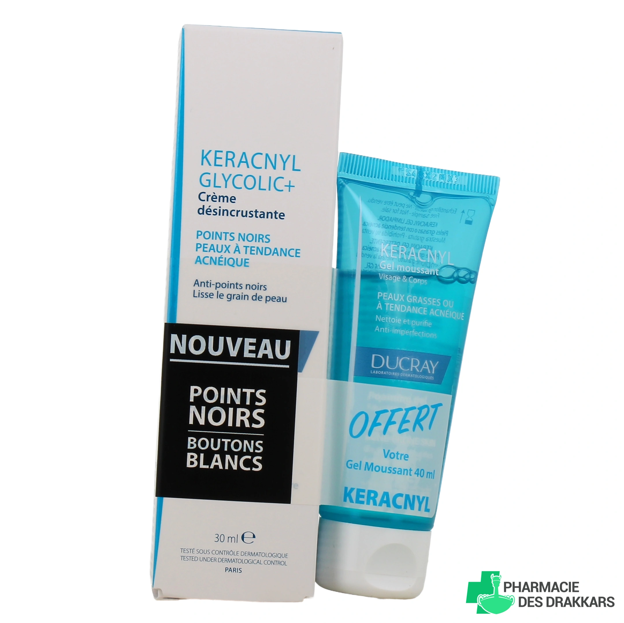 Les présentations proposées par votre pharmacie en ligne pour Ducray Keracnyl Glycolic+ Crème Désincrustante : tube de 30 ml de crème désincrustante pour les peaux à tendance acnéique et les points noirs, ou Offre Duo : Tube 30 ml de crème + Gel moussant 40 ml Offert (sous réserve de disponibilité).