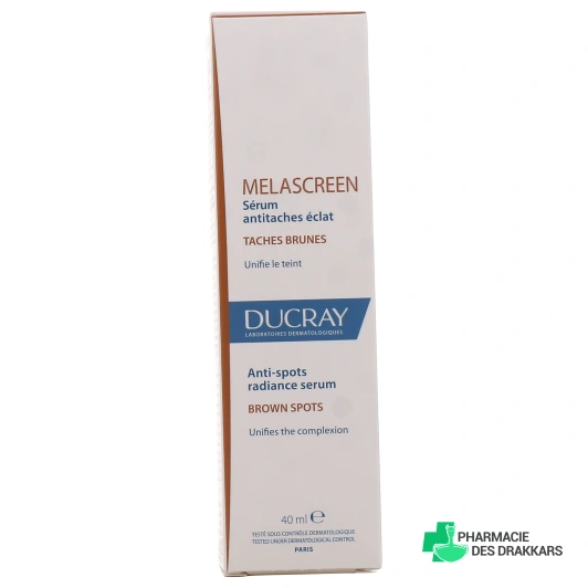Adapté à tous les types de peau, le sérum antitaches éclat Melascreen est un soin développé par les laboratoires Ducray. Il cible la problématiques des taches brunes et contribue à unifier le teint.