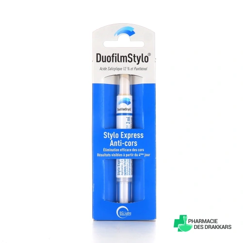 Conditionnement proposé par la Pharmacie des Drakkars : Boîte contenant 1 stylo express anti-cors Duofilm imbibé de 2 ml.