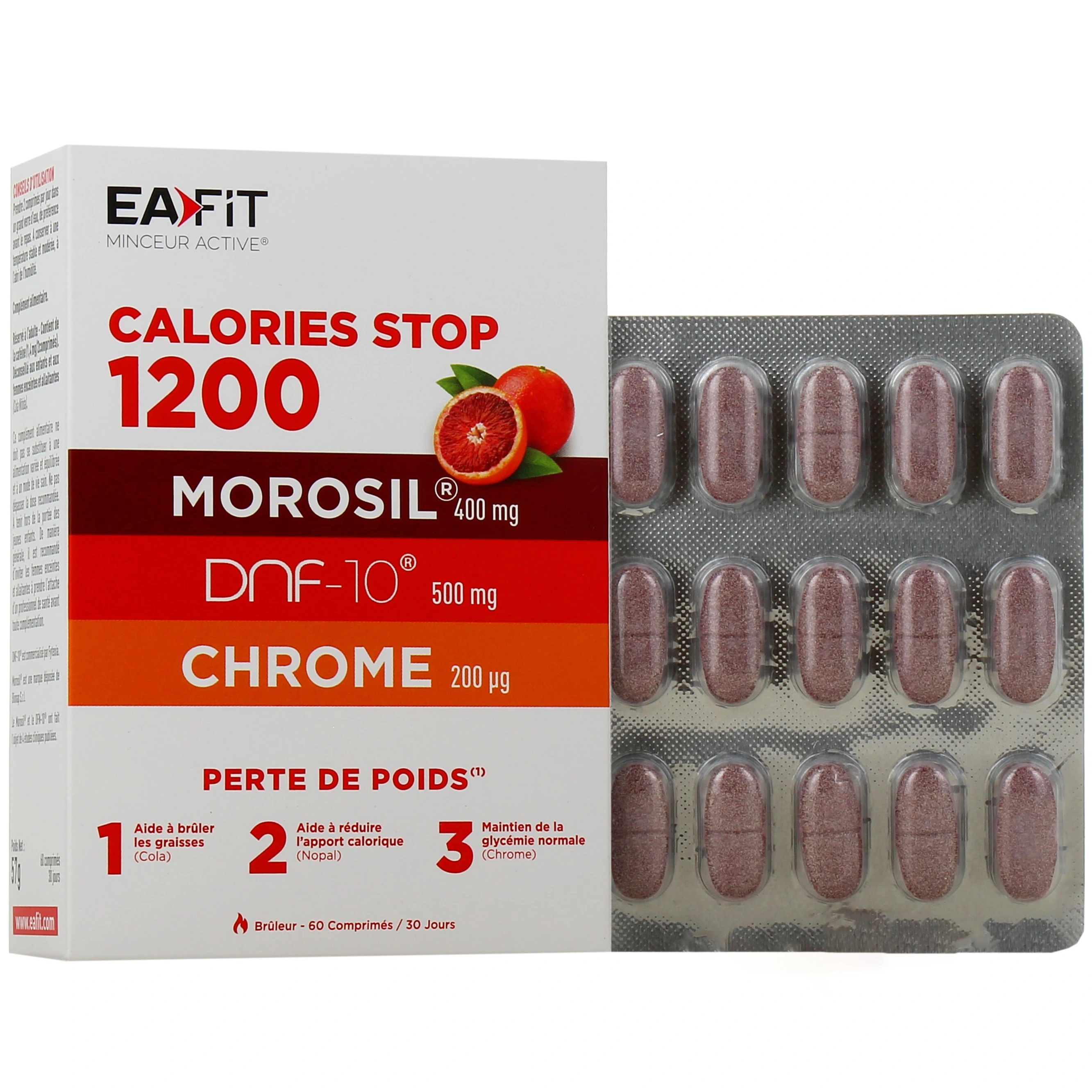 Calories Stop 1200 est un complément alimentaire pour la perte de poids proposé par la marque Eafit. Il contient notamment du cola, qui aide à brûler les graisses, et du nopal qui aide à réduire l'apport calorique.
