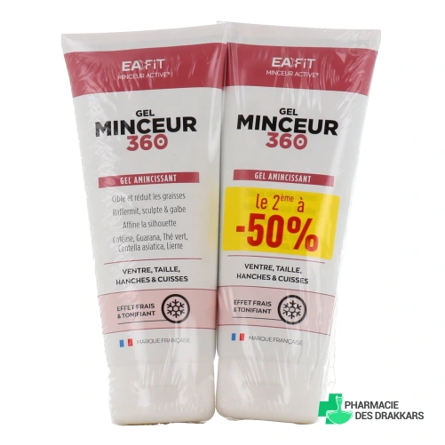 Présentation proposée pour le gel minceur 360 Eafit sur notre pharmacie en ligne : Tube 200 ml à l'unité ou en lot de 2 (le 2e à - 50 %)