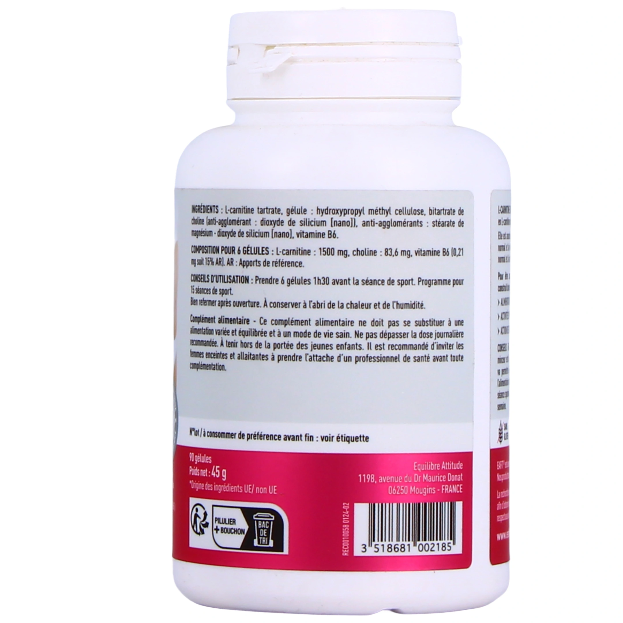 Dans ce complément alimentaire Eafit Minceur Active, La L-Carnitine est dosée à 1500 mg par jour, ce qui la place parmi les plus concentrées du marché français. Elle est associée à de la vitamine B6, qui joue un rôle essentiel dans le métabolisme énergétique et permet de renforcer la production énergétique lors d’un entraînement sportif. La choline, nutriment essentiel, contribue à réguler le métabolisme lipidique.