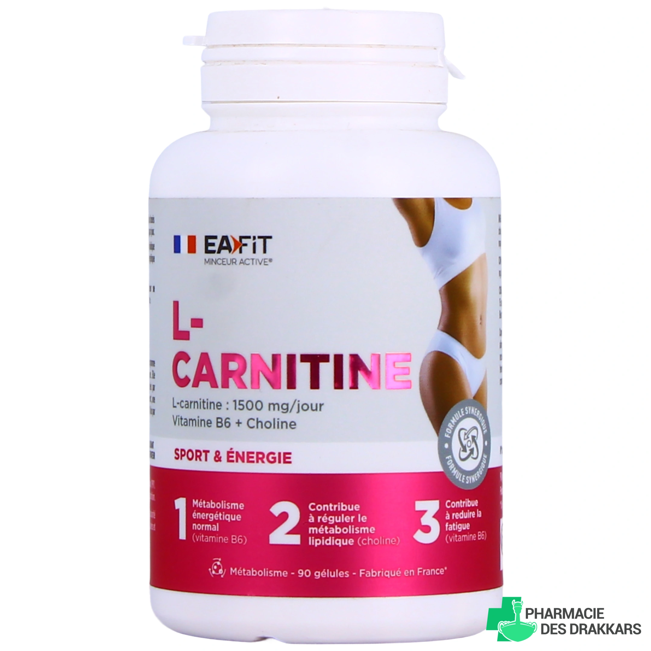 Conditionnement proposé par la Pharmacie des Drakkars pour Eafit Minceur Active L-Carnitine : Boîte de 90 gélules - Poids net : 45 g.