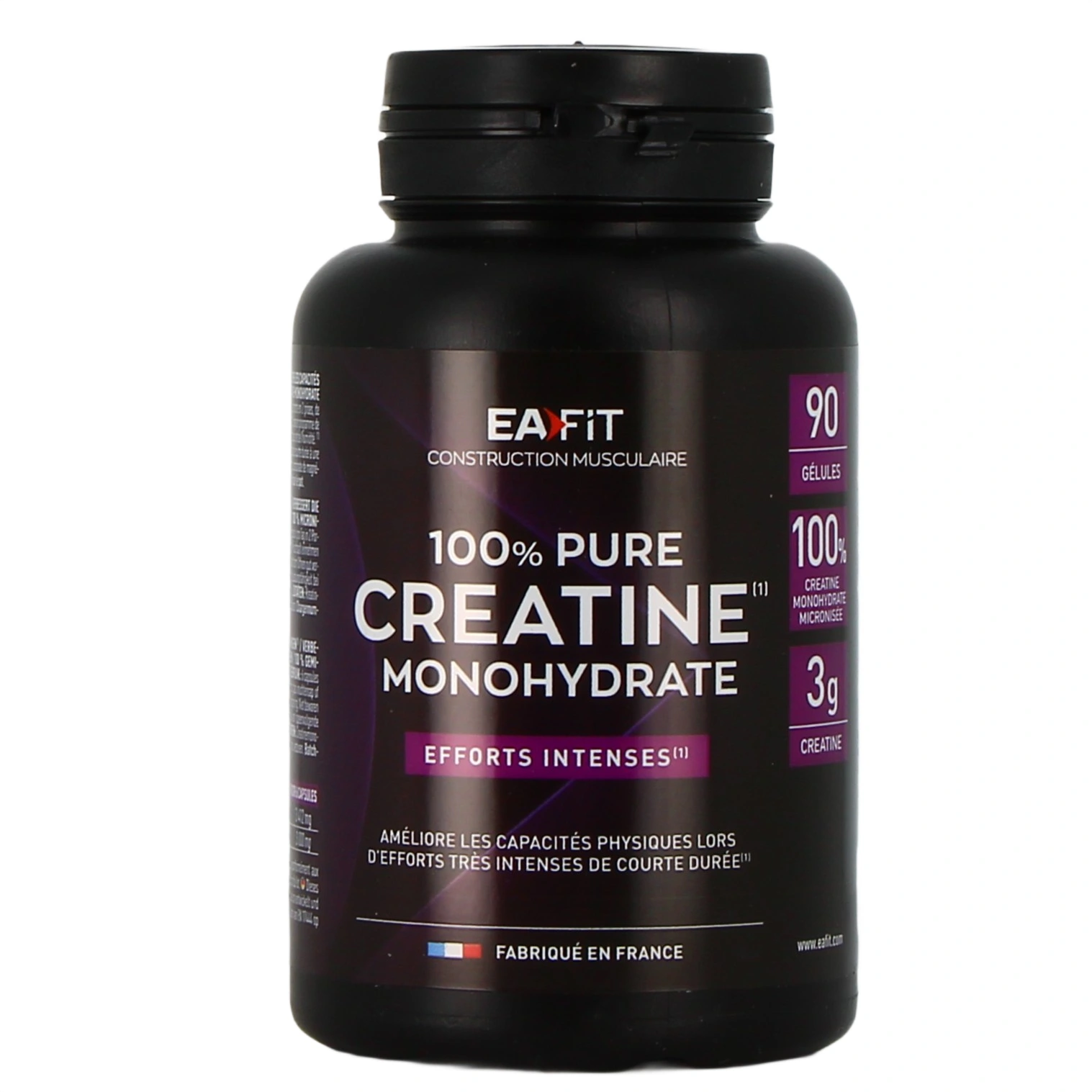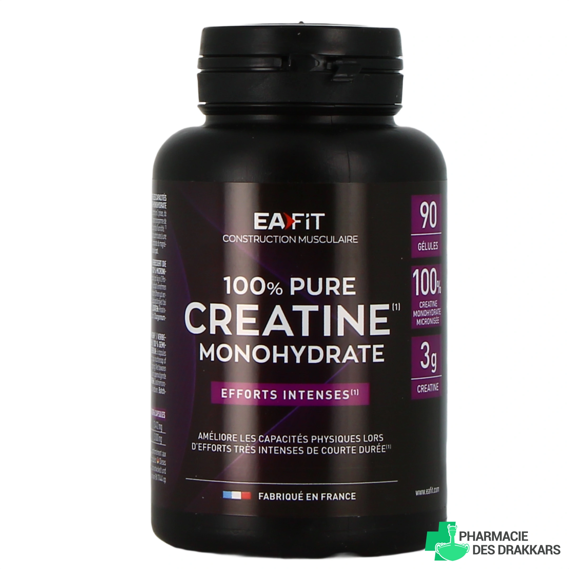Conditionnements proposés par la Pharmacie des Drakkars pour Eafit Pure Créatine : Boîte de 90 gélules ou Pot de 300 g de poudre