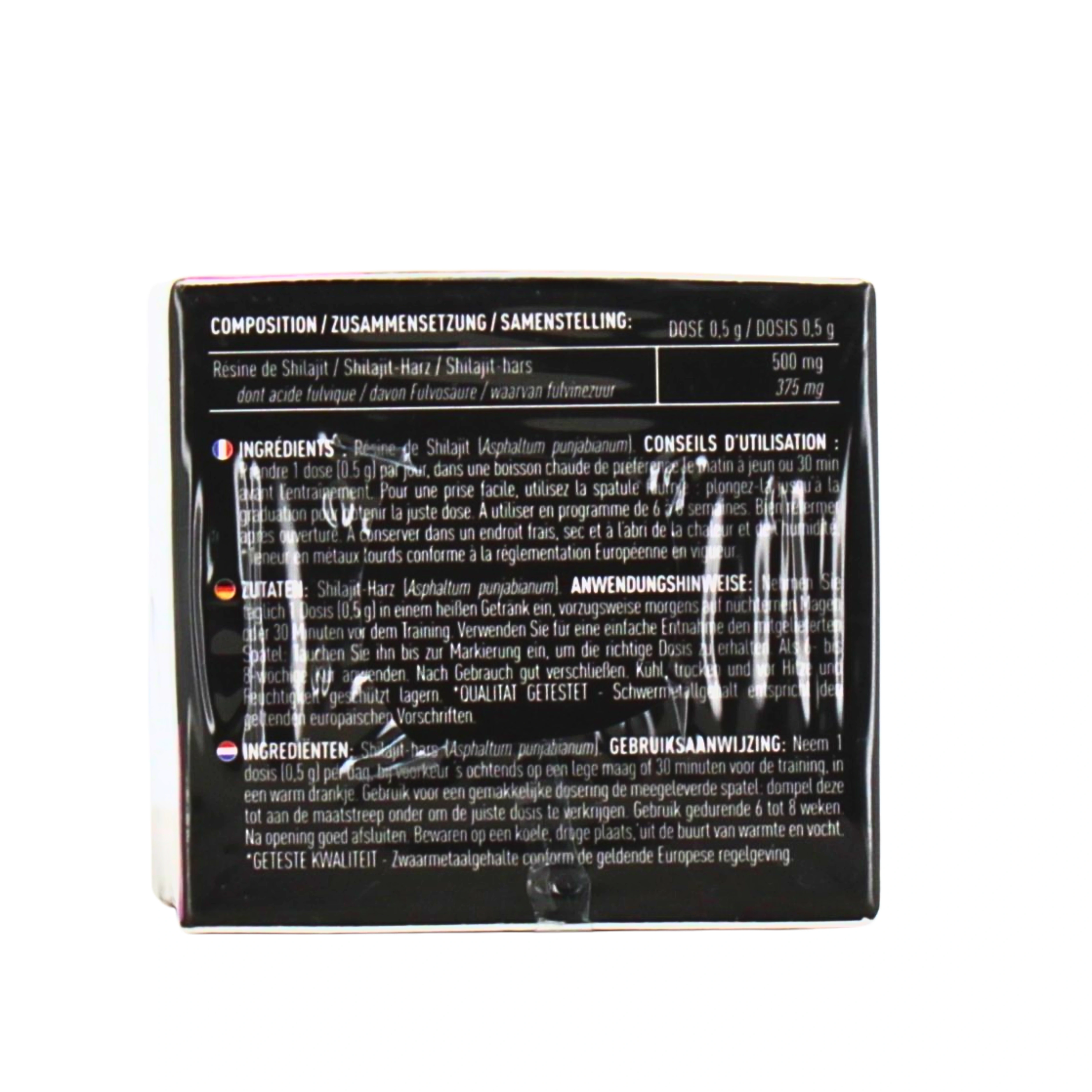 La résine pure de Shilajit Eafit est formulée à partir d'un extrait authentique et hautement purifié de shilajit pour soutenir l'énergie, la récupération musculaire et la force physique. Sans contaminants ni métaux lourdes et parfaitement conforme à la réglementation européenne, la résine de shilajit Eafit renferme des acides fulviques et humiques essentiels au métabolisme cellulaire, oligo-éléments naturels (zinc, magnésium, cuivre, zinc) acides aminés et dibenzo-α-pyrones, impliqués dans la production d'énergie et la récupération musculaire.