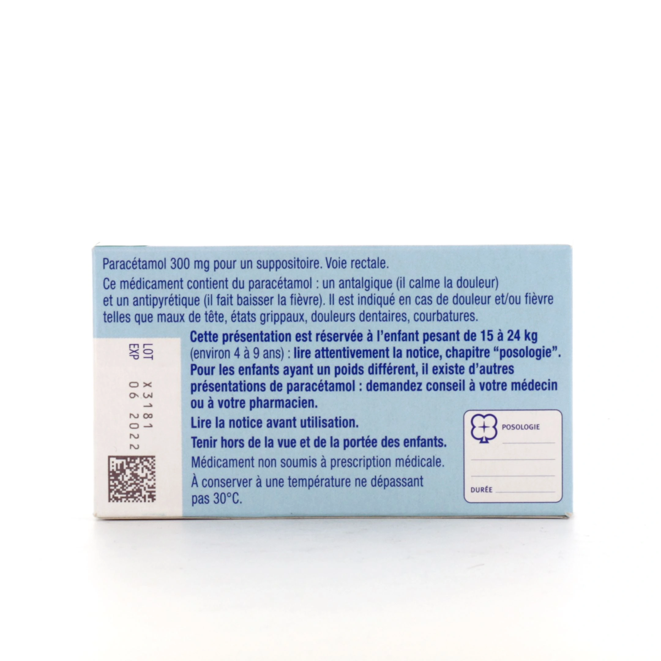 Suppositoire à 300 mg : Cette présentation est réservée à l'enfant pesant de 15 à 24 kg (environ 4 à 9 ans).
