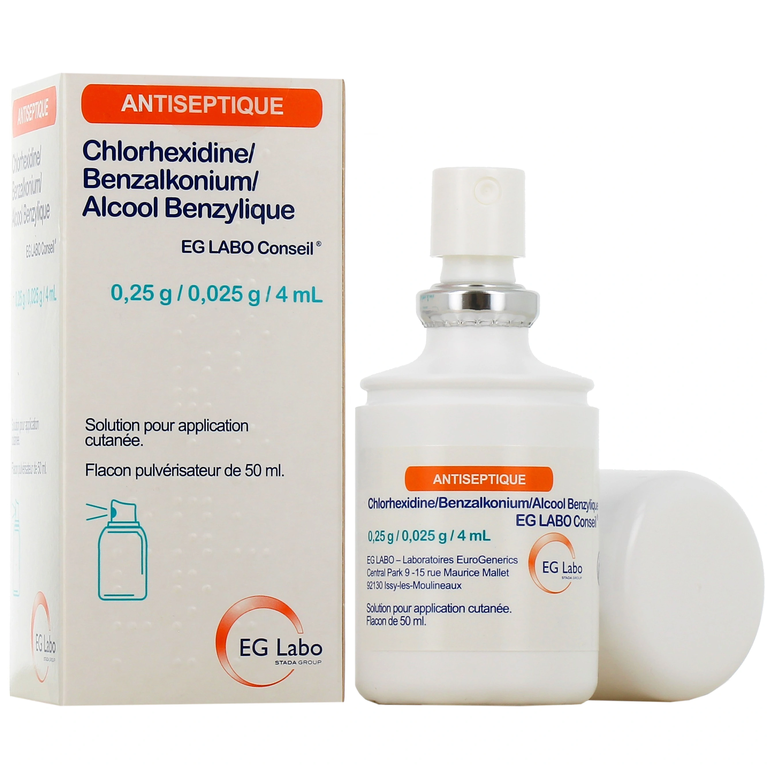 Présentation proposée pour Chlorhexidine Benzalkonium Alcool benzylique EG Labo sur la pharmacie en ligne des Drakkars : Flacon pulvérisateur de 50 ml.