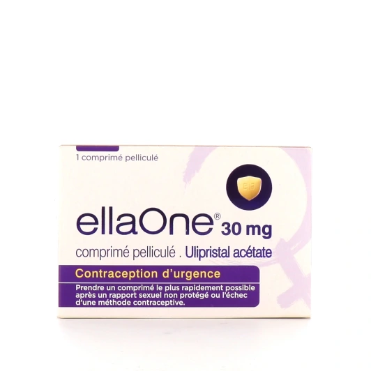 Présentation proposée pour EllaOne 30 mg comprimé pelliculé sur votre pharmacie en ligne : Boîte de 1 comprimé pelliculé