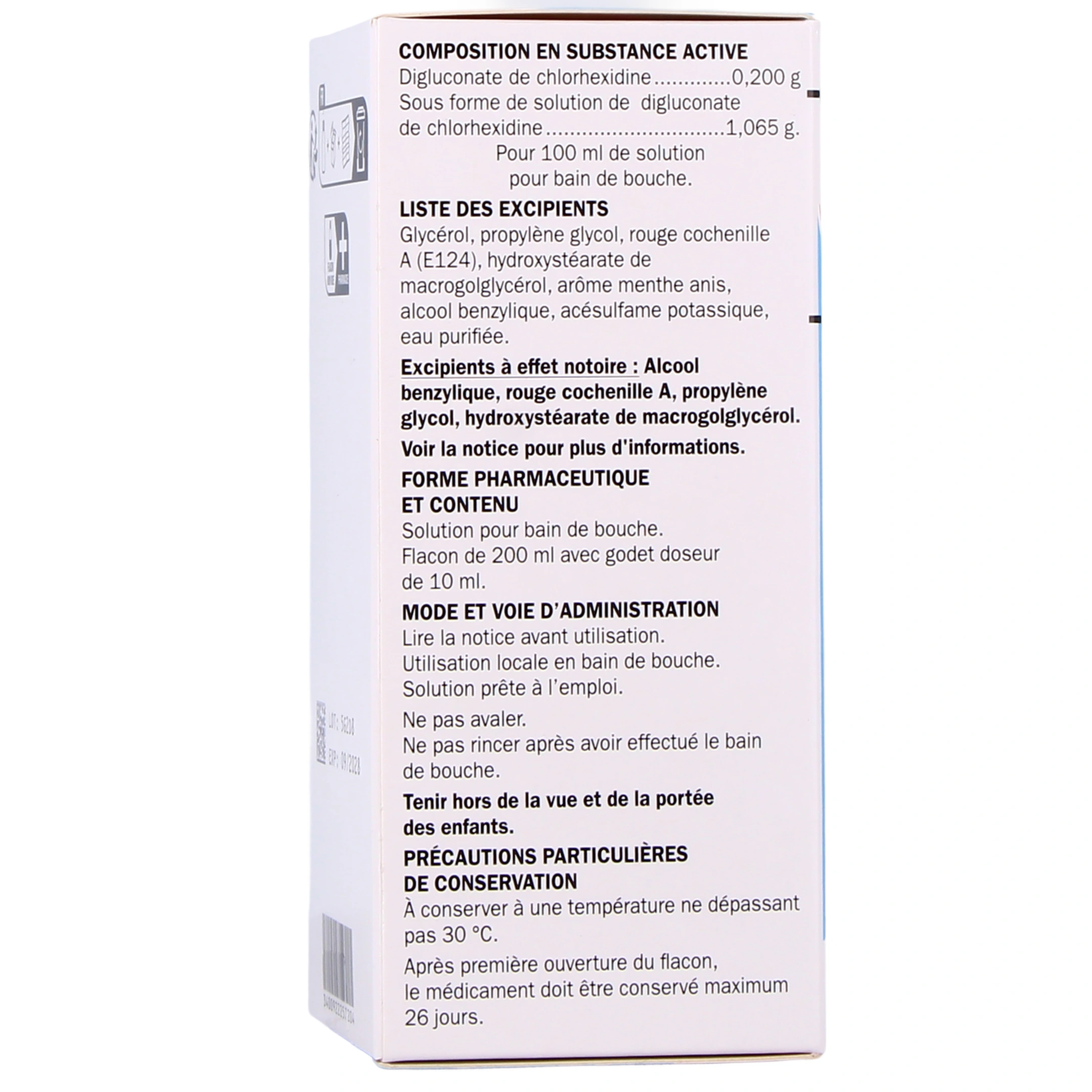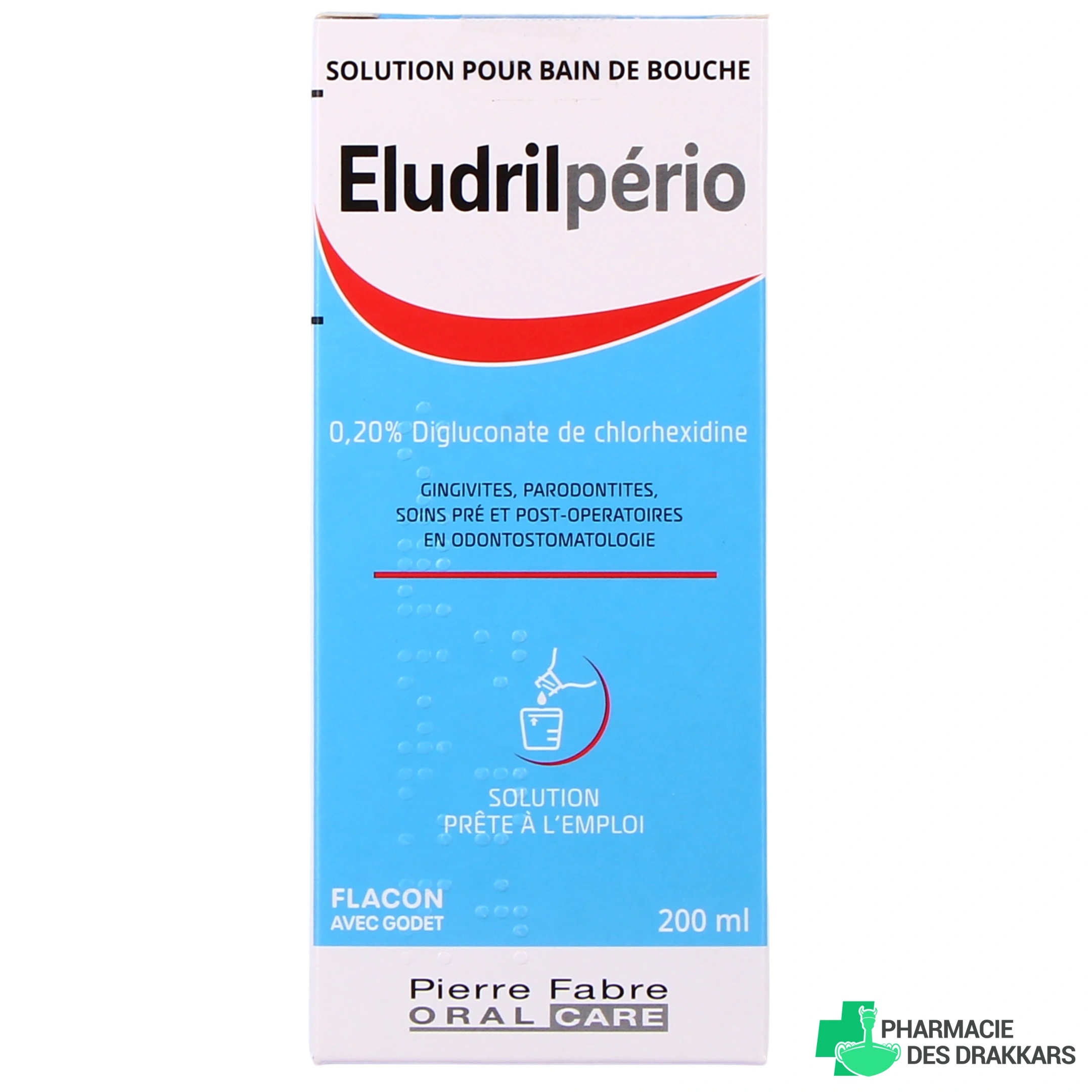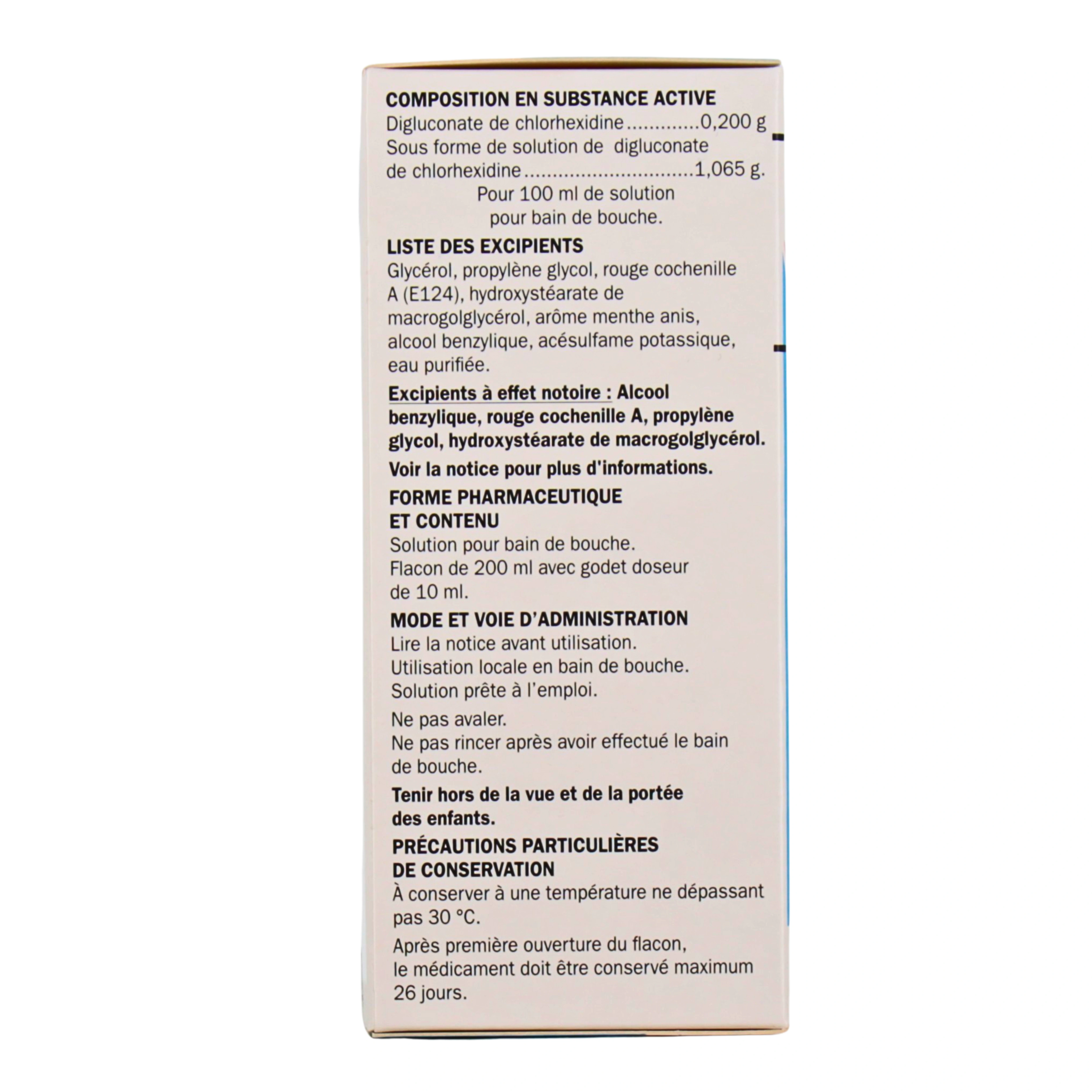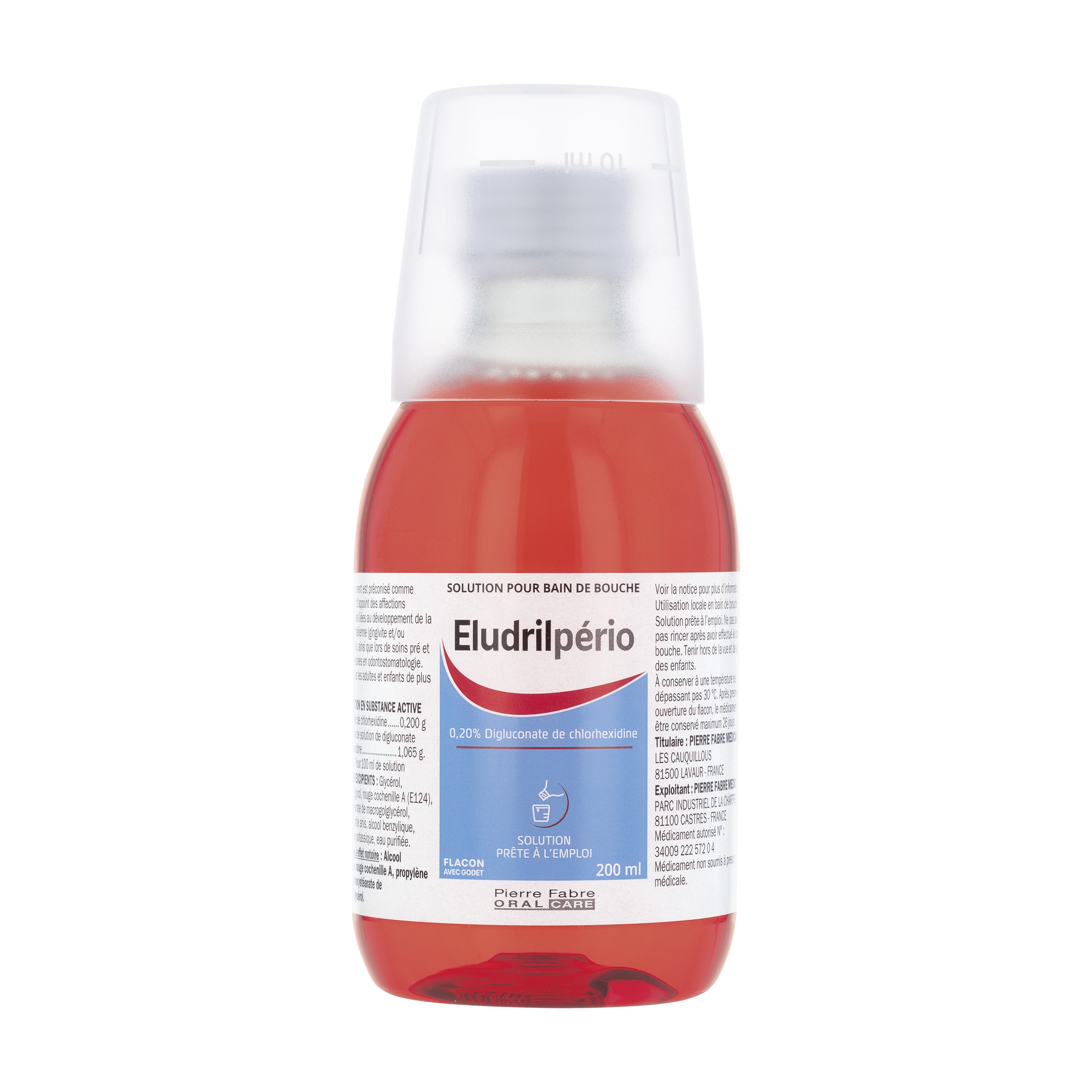 Présentation proposée sur votre pharmacie en ligne : Solution pour bain de bouche à 0,20 % (claire ; rouge) en Flacon de 200 ml avec godet doseur de 10 ml.