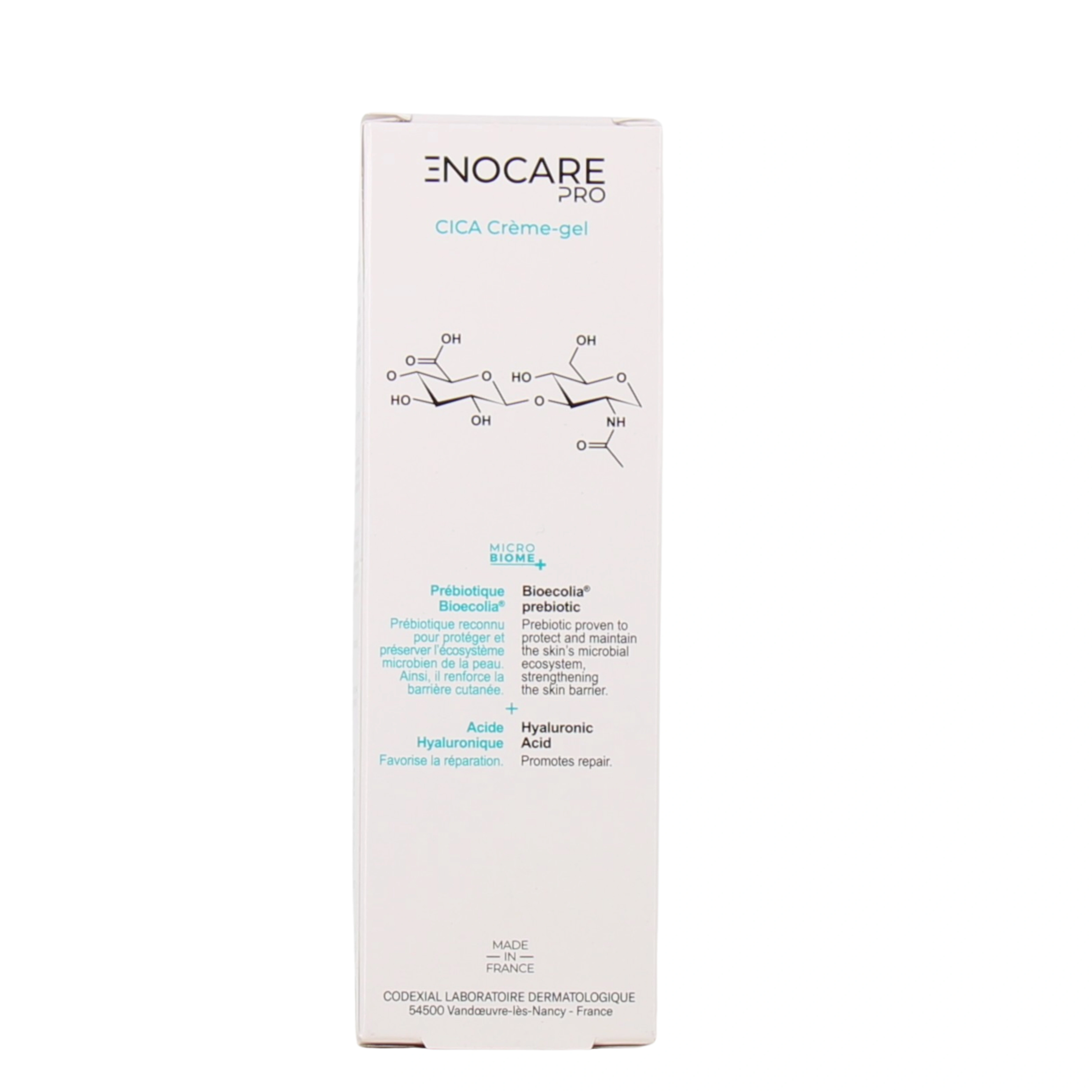 Au sein de la formule de la cica crème-gel Enocare Pro, nous retrouvons le prébiotique Bioecolia qui préserve les bonnes bactéries de la peau, participe à la réduction des irritations et soutient les défenses naturelles de la peau. L'aloe vera réputé pour ses propriétés hydratantes, apaisantes et réparatrices ainsi que l'acide hyaluronique contribuent à apaiser l'épiderme, à hydrater intensément et à repulper les tissus. Finalement, le beurre de karité nourrit et aide à maintenir l'hydratation du fait de sa richesse en acides gras et en vitamines.