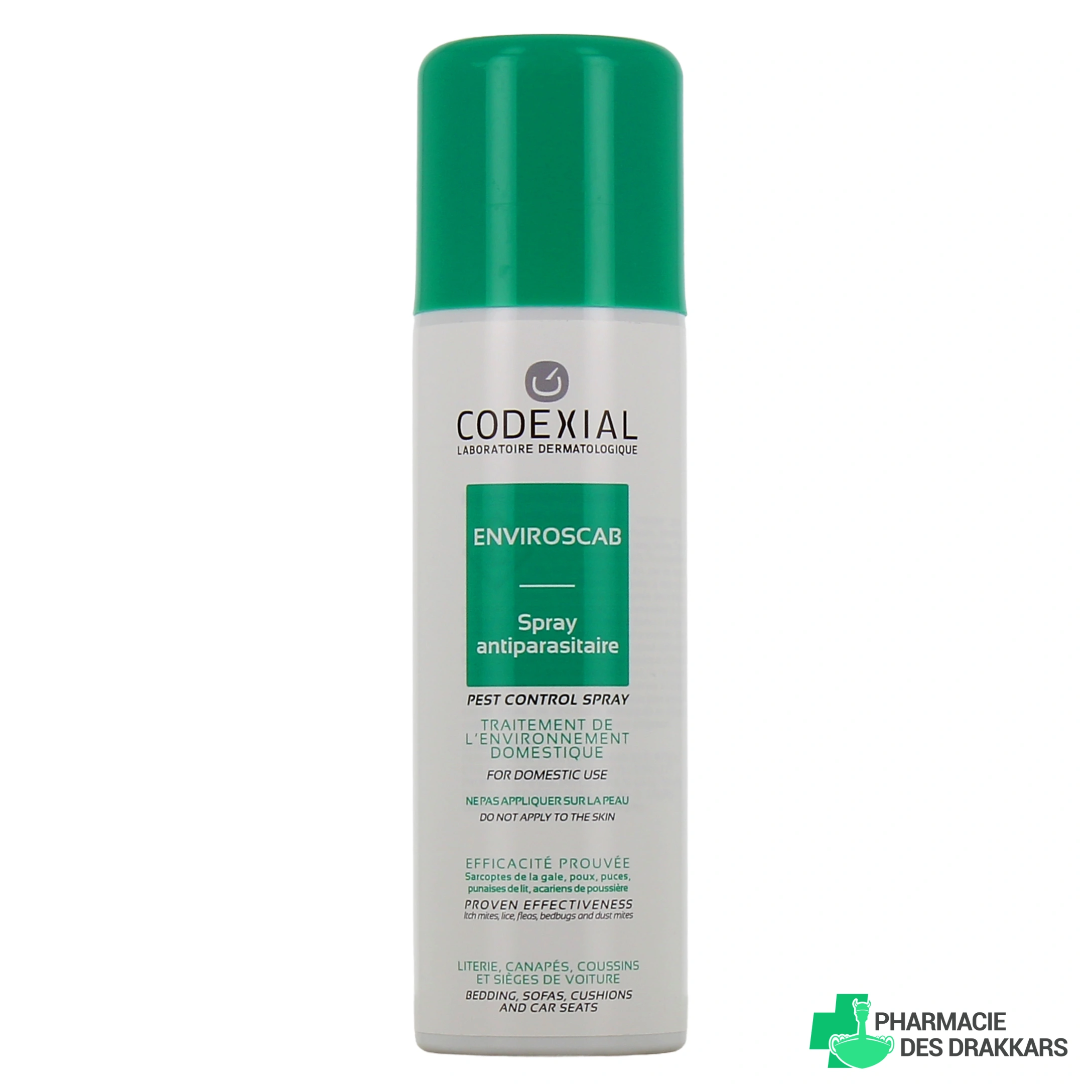 Présentation proposée par votre pharmacie en ligne pour l'aérosol antiparasitaire Enviroscab Codexial : Aérosol de 200 ml.