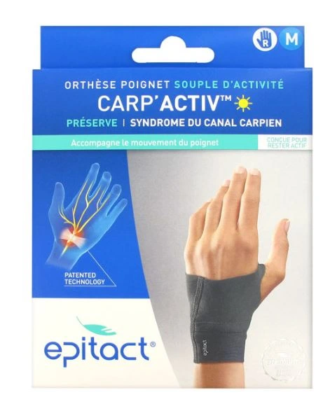 Conditionnement proposé par la Pharmacie des Drakkars : Boîte contenant une orthèse de poignet Carp'Activ Epitact - Taille et côté au choix.