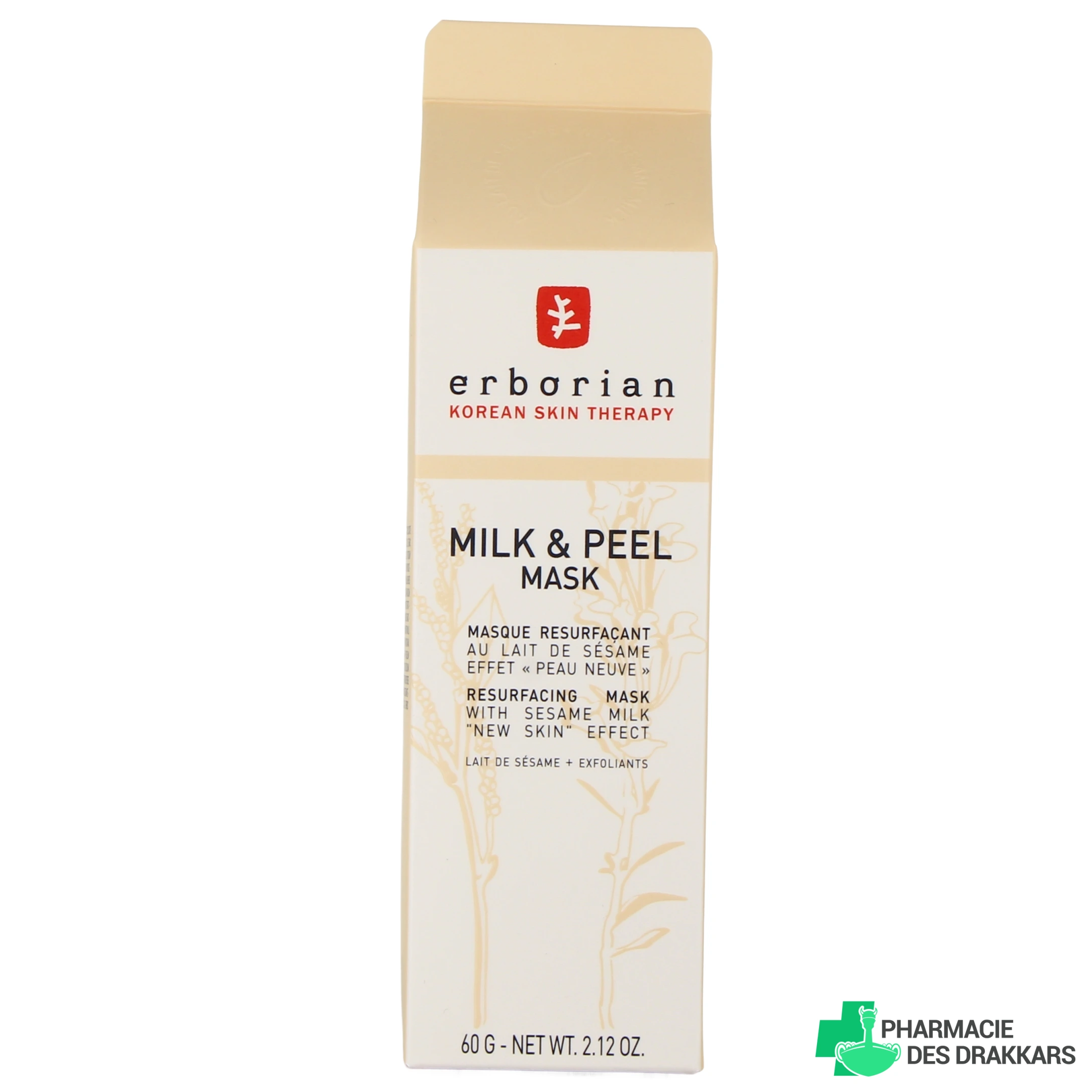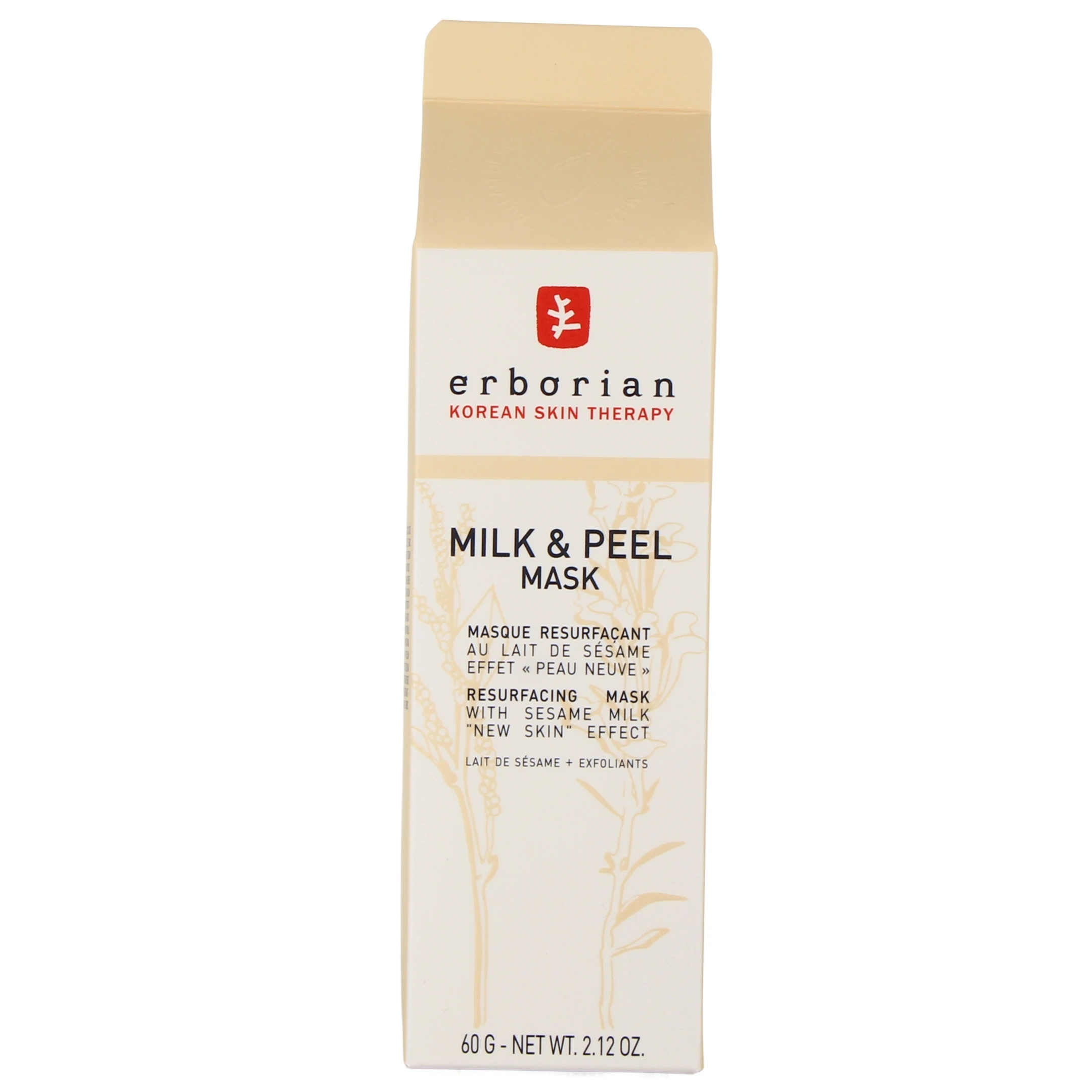 Conditionnement disponible sur votre pharmacie en ligne pour le masque resurfaçant au lait de sésame Erborian Milk & Peel : tube de 60 g.