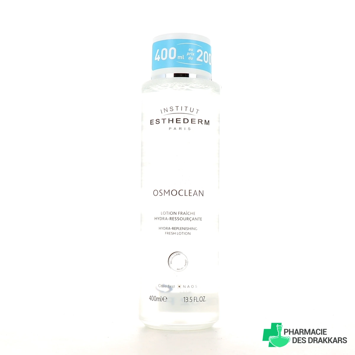 Formats proposés par la Pharmacie des Drakkars : flacon de 200ml ou de 400ml de lotion fraîche hydra-ressourçante Osmoclean Institut Esthederm.