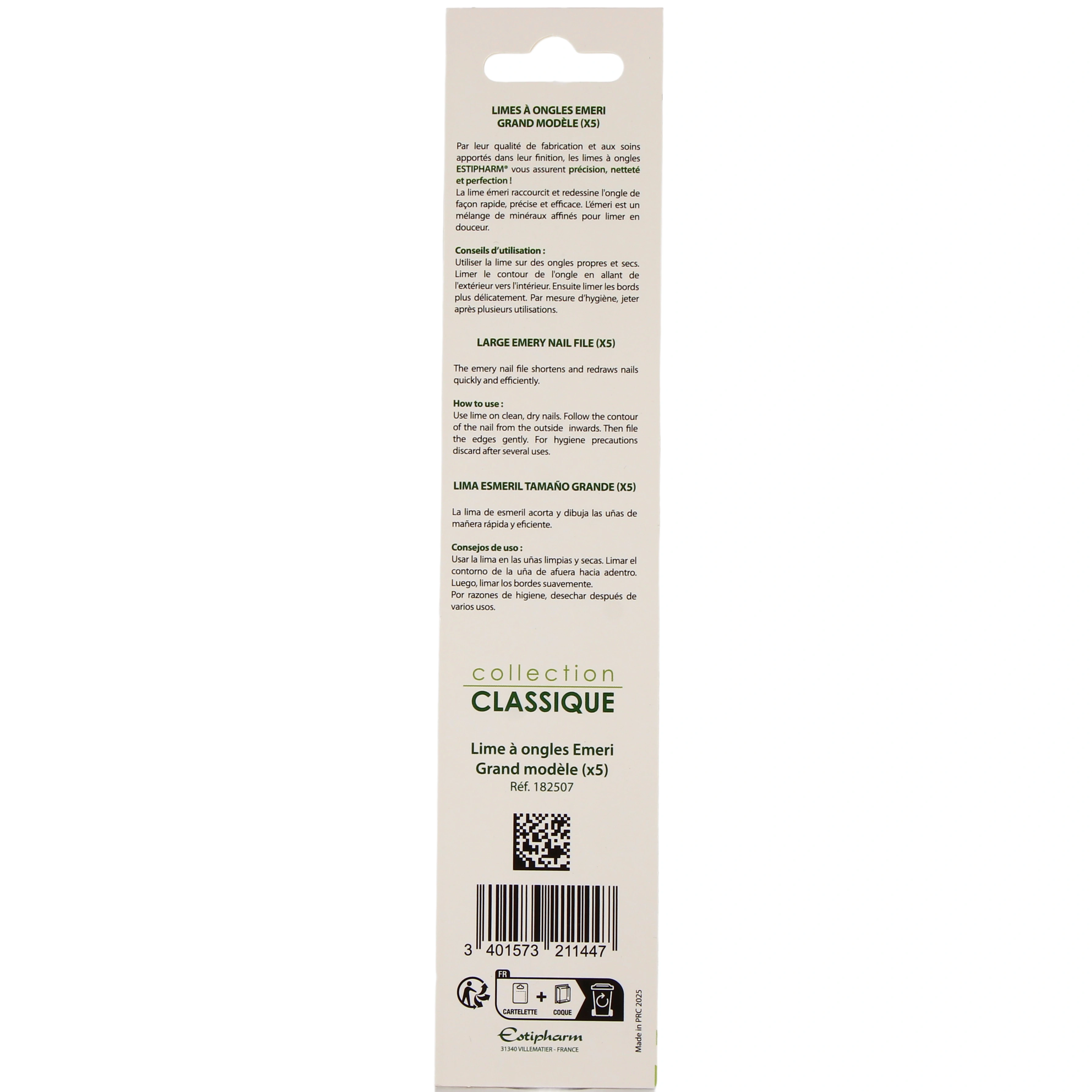 Pour vous permettre de réaliser votre manucure à la maison, la marque Estipharm vous propose sa lime à ongles émeri. Cet accessoire beauté aide à raccourcir les ongles et à leur donner la forme souhaitée.