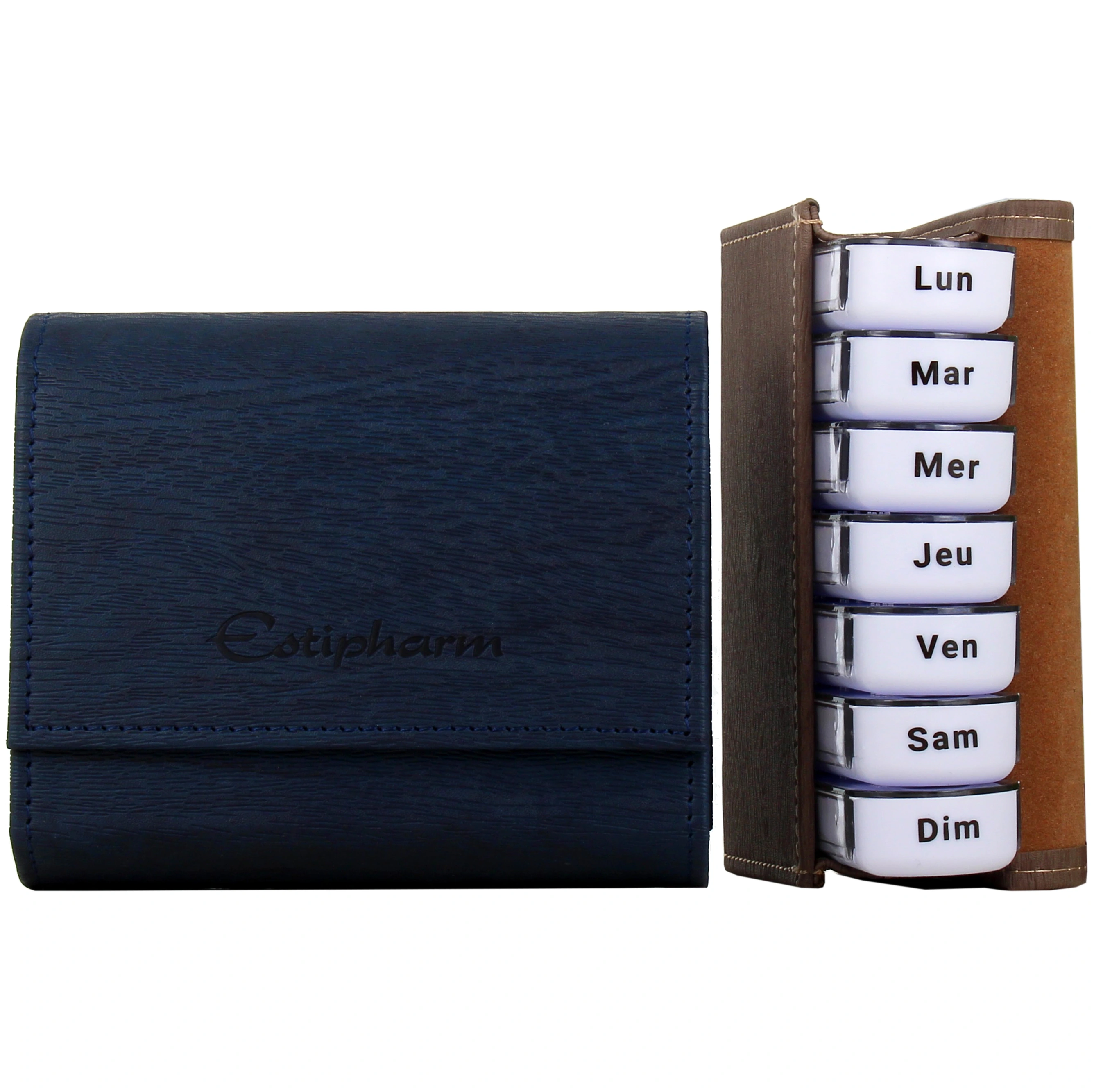 Ce pilulier hebdomadaire 7 cases Estipharm est en réalité composé de 7 piluliers journaliers individuels, chacun portant le nom d'un jour de la semaine. Ces piluliers journaliers sont eux-mêmes composés de 4 cases, qui correspondent aux différents moments de la journée auxquels prendre ses traitements et médicaments : Matin, Midi, Soir et Coucher. Ces piluliers quotidiens se rangent et se transportent dans un joli étui souple et élégant, doté d'une fermeture aimantée très pratique et ne nécessitant pas de force pour l'ouvrir.
