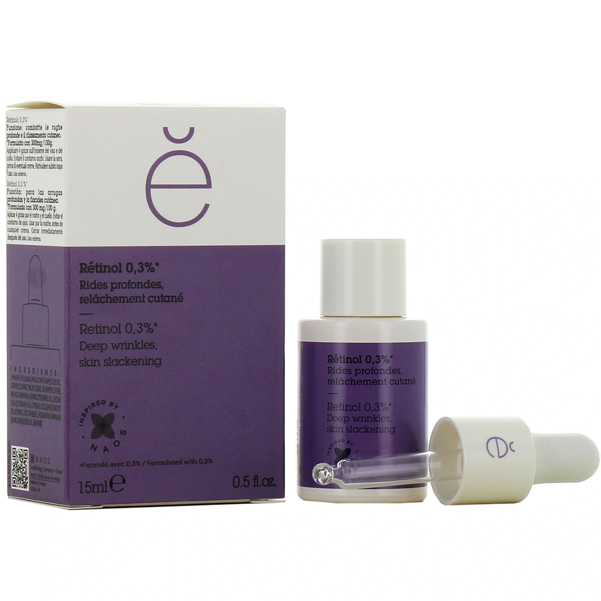 Dans le domaine de l'anti-âge, le rétinol est un ingrédient de référence dont l'efficacité a été démontrée par de nombreuses études cliniques. Ici, le rétinol Etat Pur est proposé avec un dosage à 0,3%.