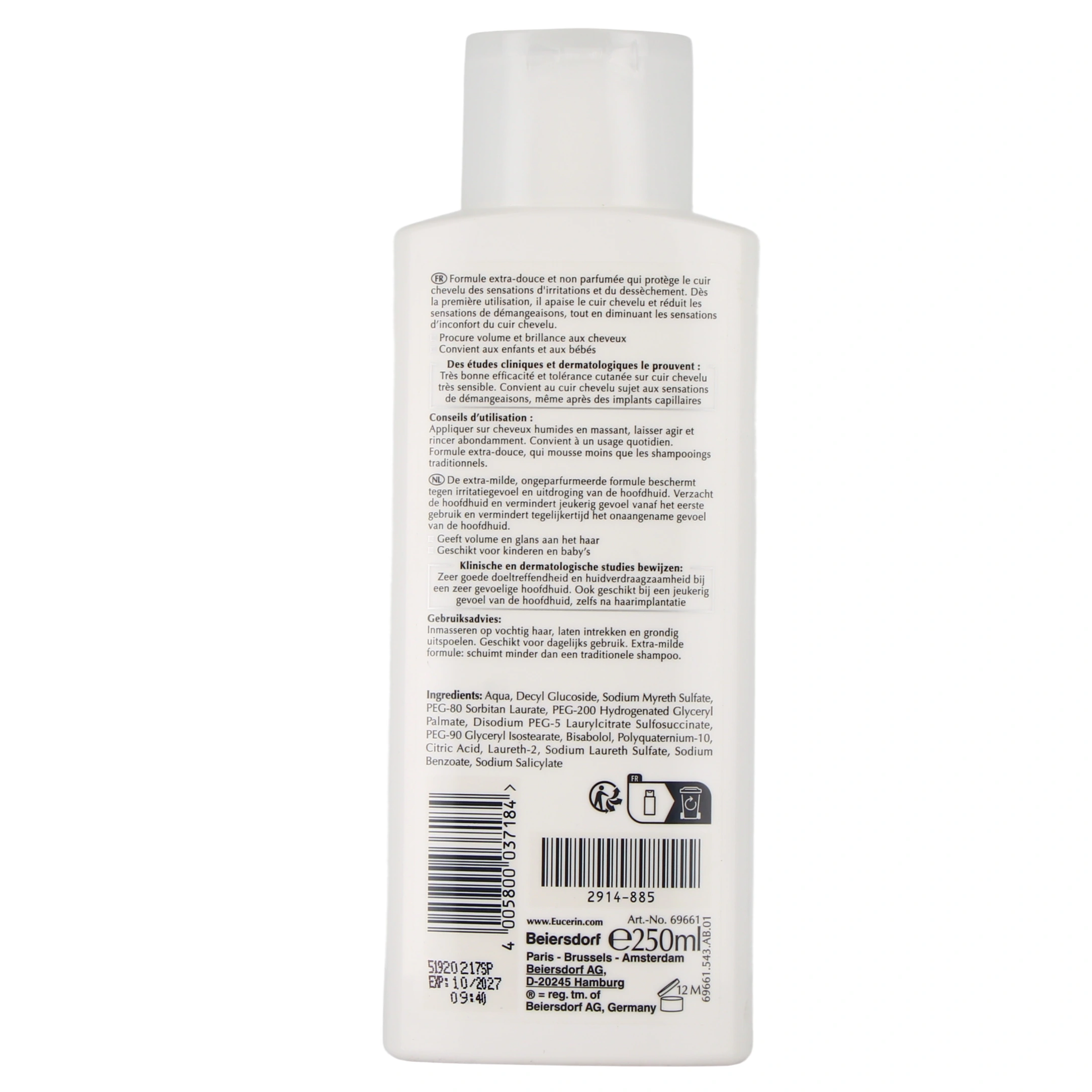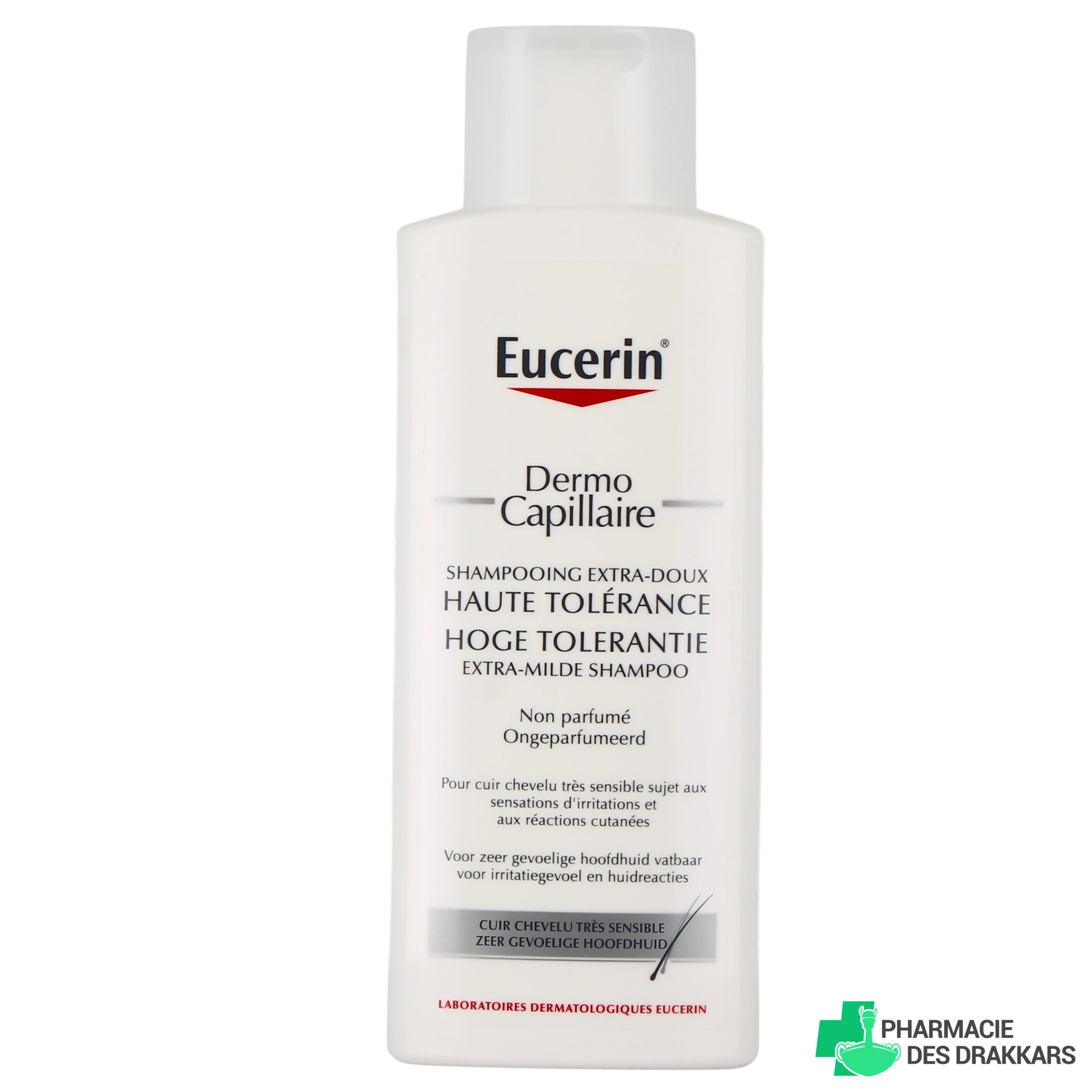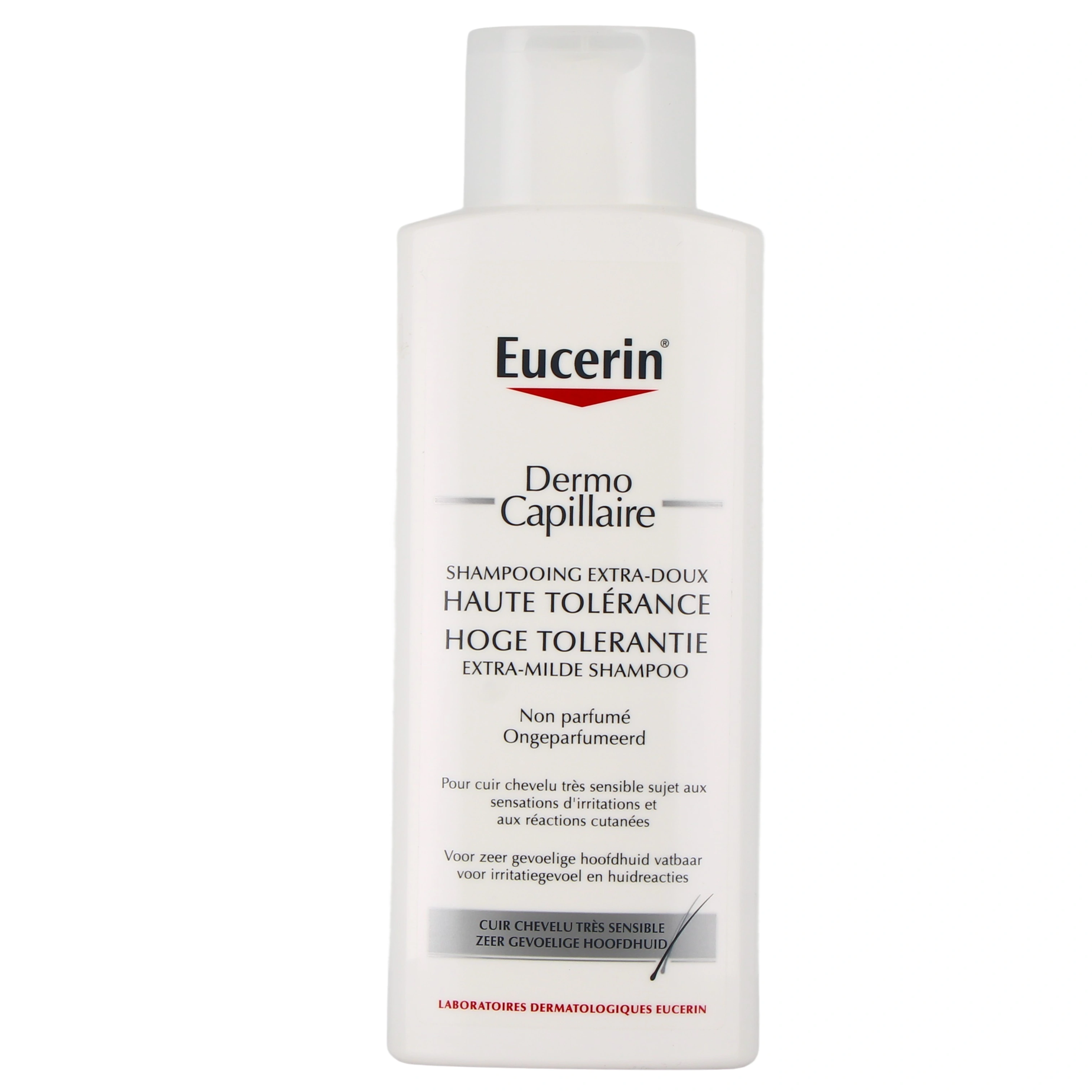 Présentation proposée par votre pharmacie en ligne : Eucerin Dermo Capillaire Shampoing Haute Tolérance flacon de 250 ml.