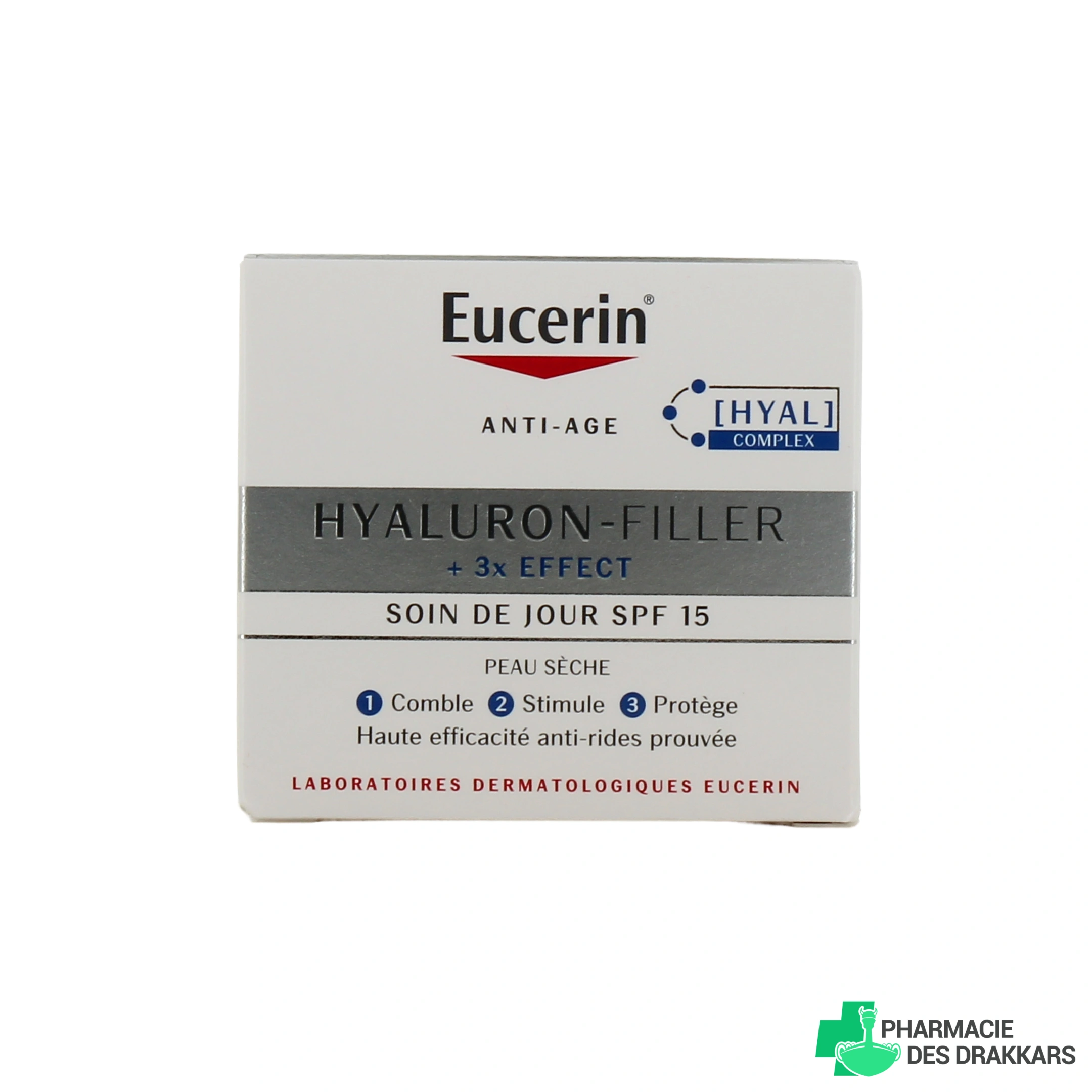 Le soin de jour Hyaluron-Filler +3x Effect SPF 15 pour peau sèche de la gamme Eucerin est un soin anti-âge spécialement formulé pour les peaux sèches. Il permet de combler les rides même profondes grâce à sa formule contenant de la saponine, un actif qui stimule la fabrication de l'acide hyaluronique de la peau, ainsi que de l'acide hyaluronique pour combler les rides.