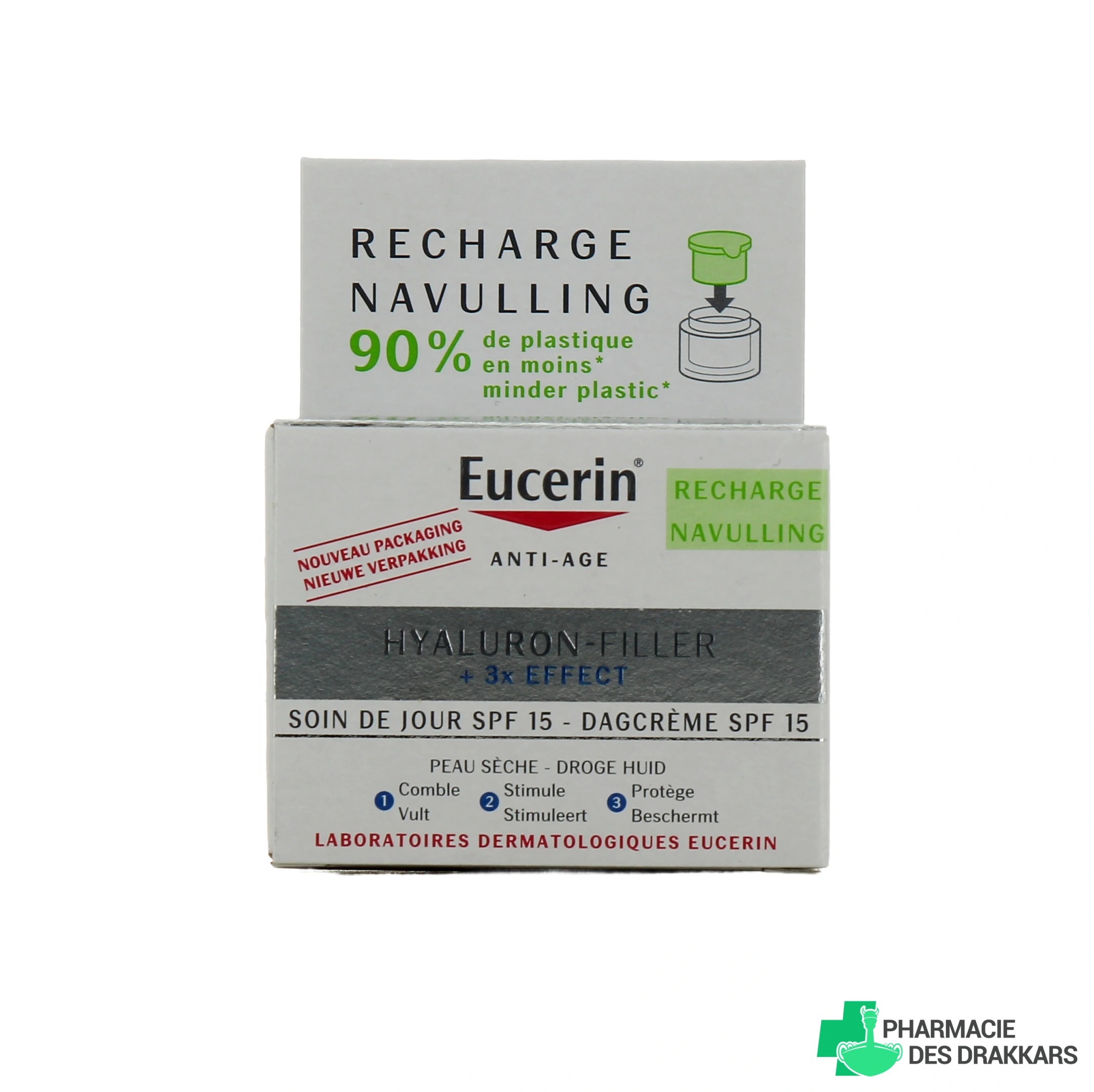 Les présentations disponibles chez Pharmacie des Drakkars pour le soin de jour Hyaluron-Filler +3x Effect SPF 15 Peau Sèche : pot de 50 ml et sa Recharge 50 ml.