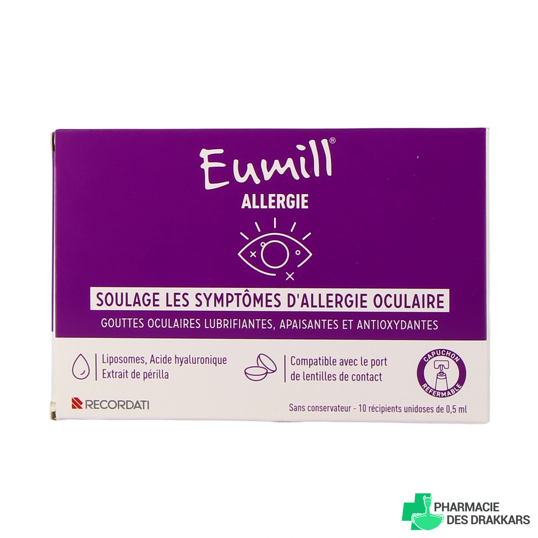 Les gouttes oculaires Eumill Allergie possèdent des vertus lubrifiantes, apaisantes et antioxydantes. Elles sont formulées à partir de liposomes, d'acide hyaluronique et d'extrait de périlla, et présente l'avantage de pouvoir être utilisées par les personnes qui portent des lentilles de contact. Eumill Allergie est également disponibles en différents formats : un flacon unique de 10 ml, ou des unidoses de 0,5 ml avec un capuchon refermable, très pratique pour pouvoir en emmener avec vous et les utiliser dès que nécessaire.
