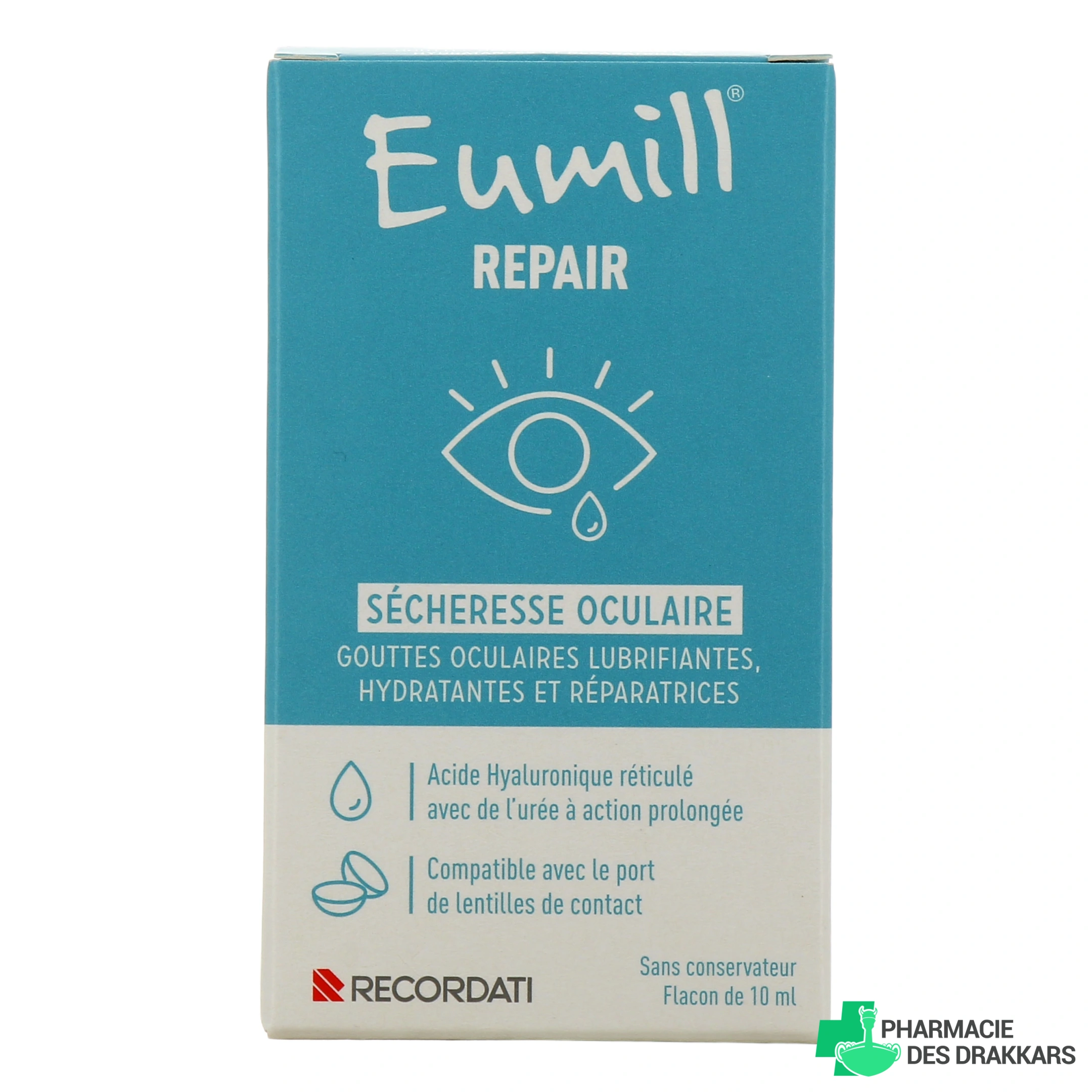 Eumill Repair proposé par le laboratoire Bouchara Recordati est une solution stérile à usage ophtalmique indiqué en cas d'œil sec. Il s'agit d'un collyre lubrifiant, hydratant et réparateur à base d'acide hyaluronique réticulé avec de l'urée.
