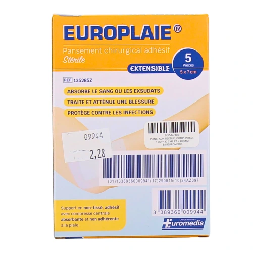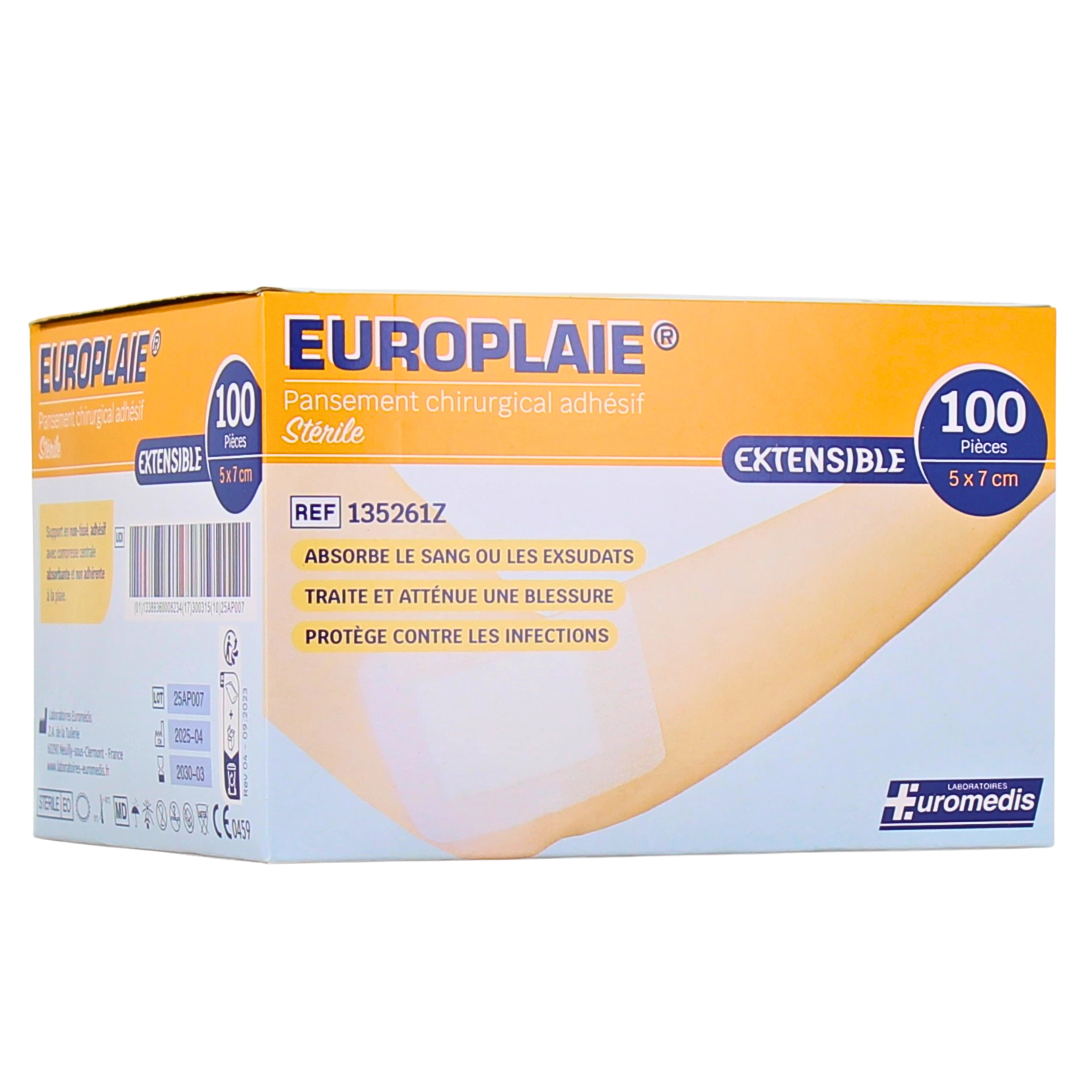 Idéal pour les plaies post-opératoires, le pansement Europlaie est également indiqué en cas de plaies exsudatives superficielles, de coupures ou d'écorchures. Il est composé d'un support adhésif contenant au centre une compresse en non tissé recouverte d'un film qui empêche l'adhérence de la compresse à la plaie.