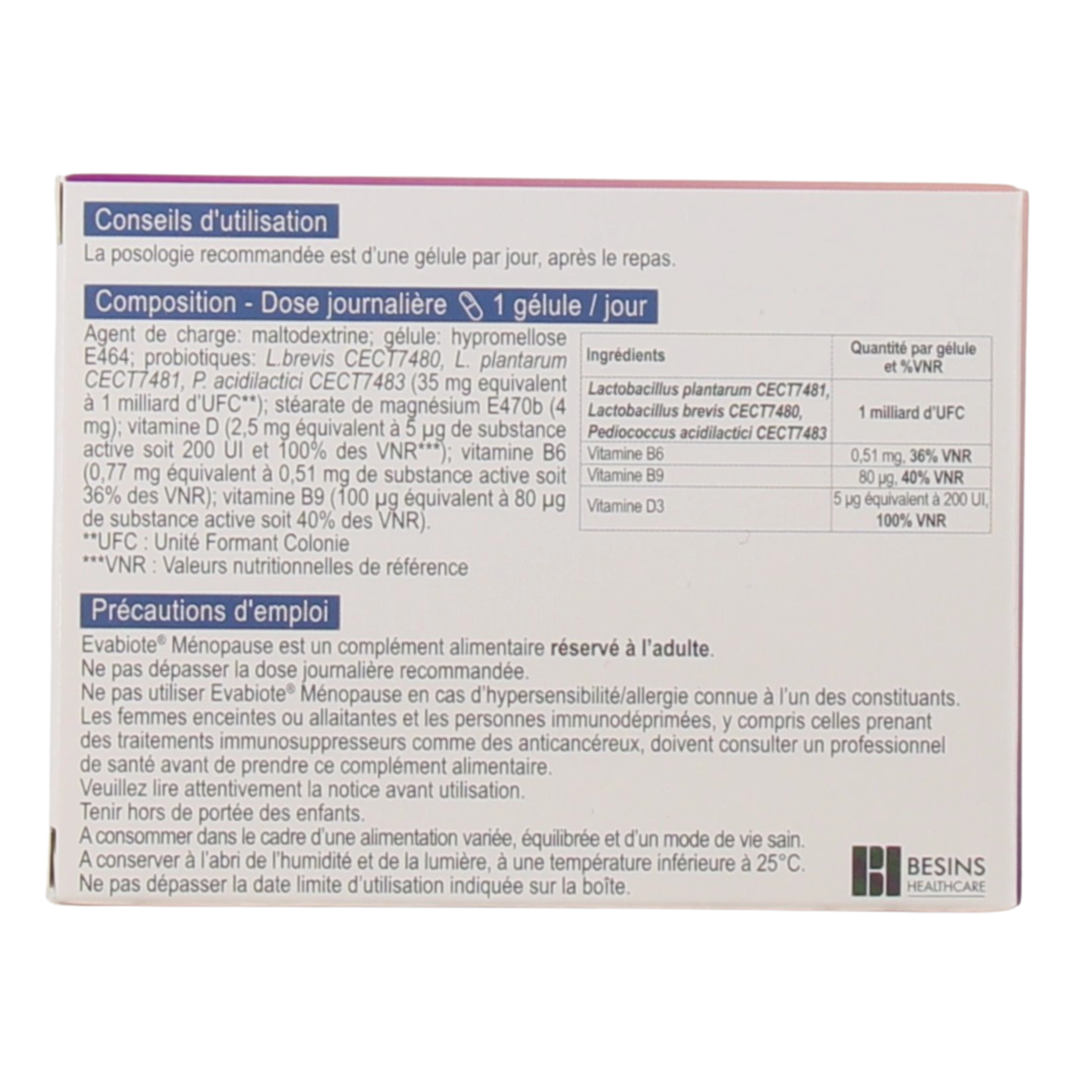 Evabiote Ménopause est un complément alimentaire formulé à partir de probiotiques (Lactobacillus plantarum, Lactobacillus brevis et Pediococcus acidilactici) et de vitamines pour contribuer à la régulation de l'activité hormonale et à la réduction de la fatigue :