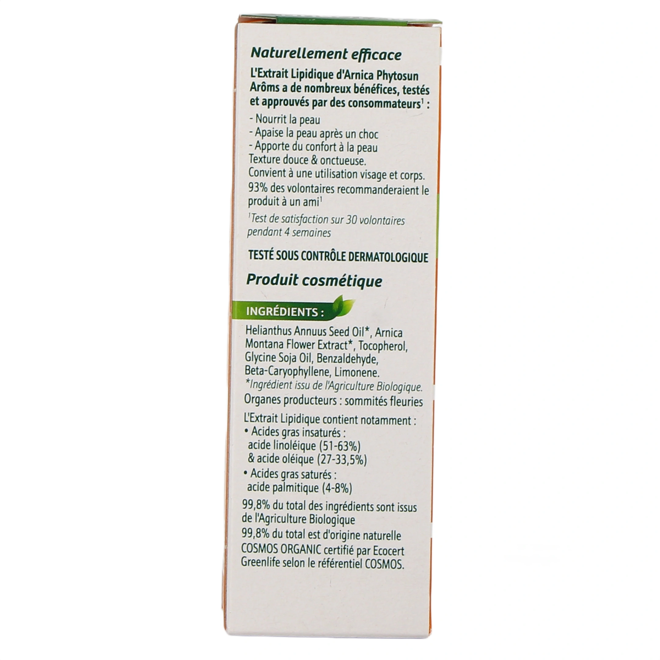 Formulé à 99.8% d'ingrédients d'origine naturelle, l'extrait lipidique d'Arnica Bio de Phytosun Arôms est une huile végétale indiquée pour nourrir et apaiser les peaux agressées et sensibilisées, après un choc par exemple, pour réduire la visibilité des bleus.