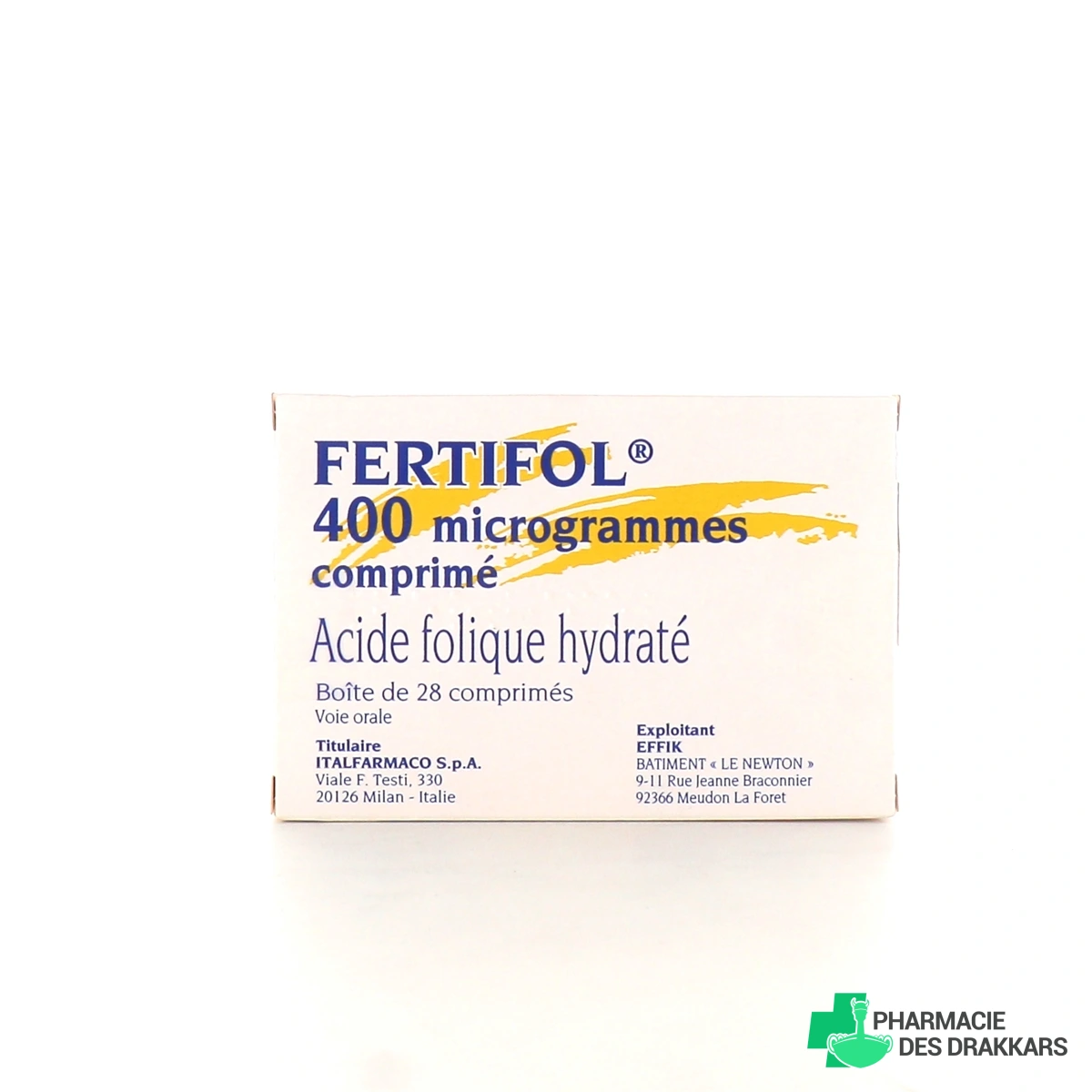Vous pourrez retrouver les comprimés d'acide folique Fertifol 400 µg dans les conditionnements suivants sur notre pharmacie en ligne : boîte de 28 ou 90 comprimés sous plaquette.