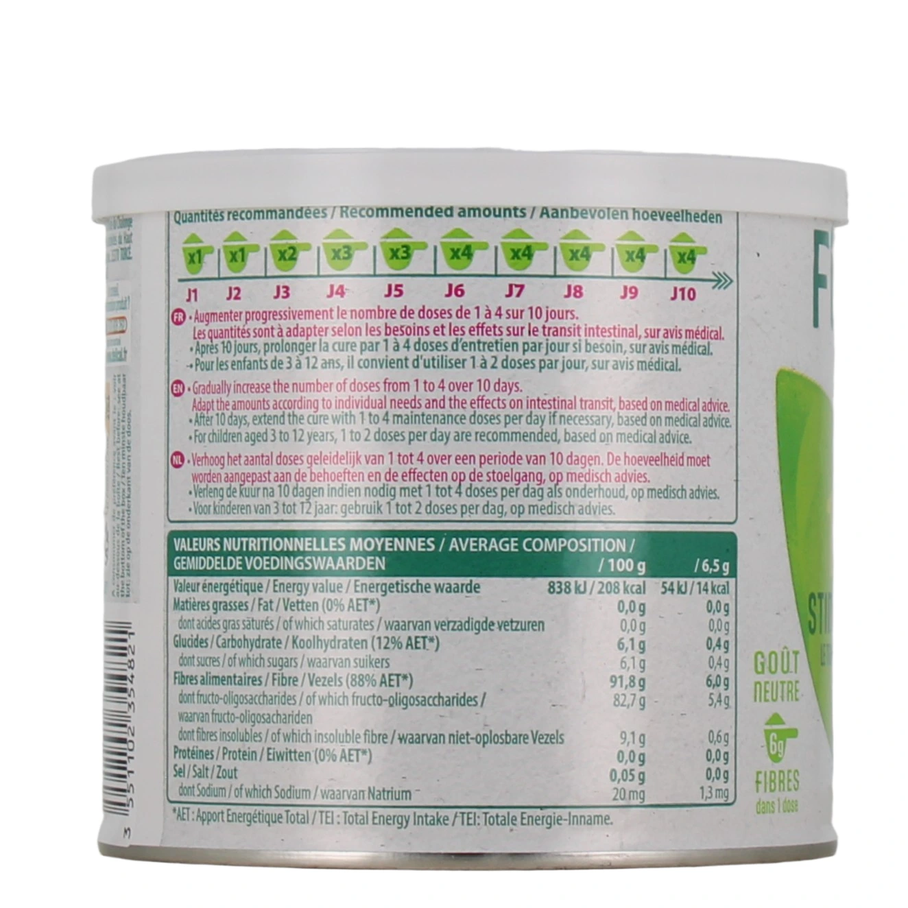 L'une des particularités de Fibreline Transit réside dans sa double action, qui repose sur une combinaison de deux types de fibres visant à la fois à stimuler et à réguler l'activité intestinale. Sa formule est 100 % végétale et contient une concentration particulièrement élevée en fibres, avec 91,8 g de fibres pour 100 g de poudre.