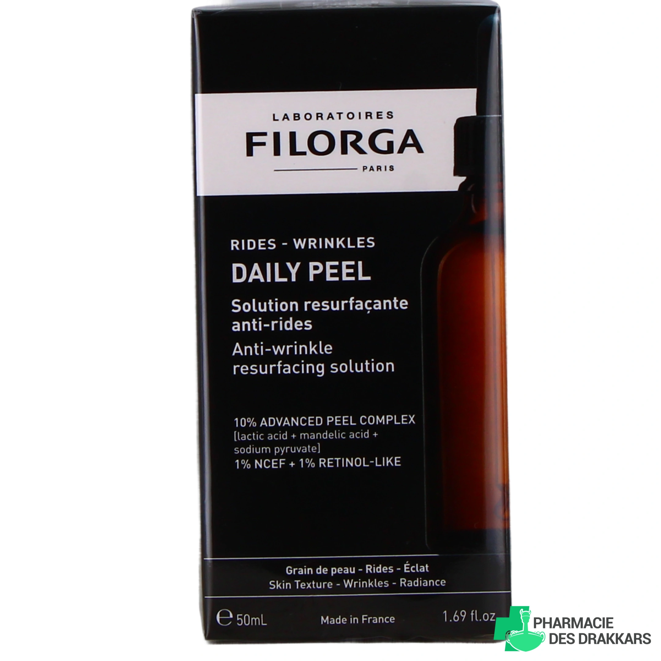 Conditionnement proposé sur notre pharmacie en ligne pour Filorga Daily Peel Solution Anti-Rides : flacon-pipette de 50 ml.