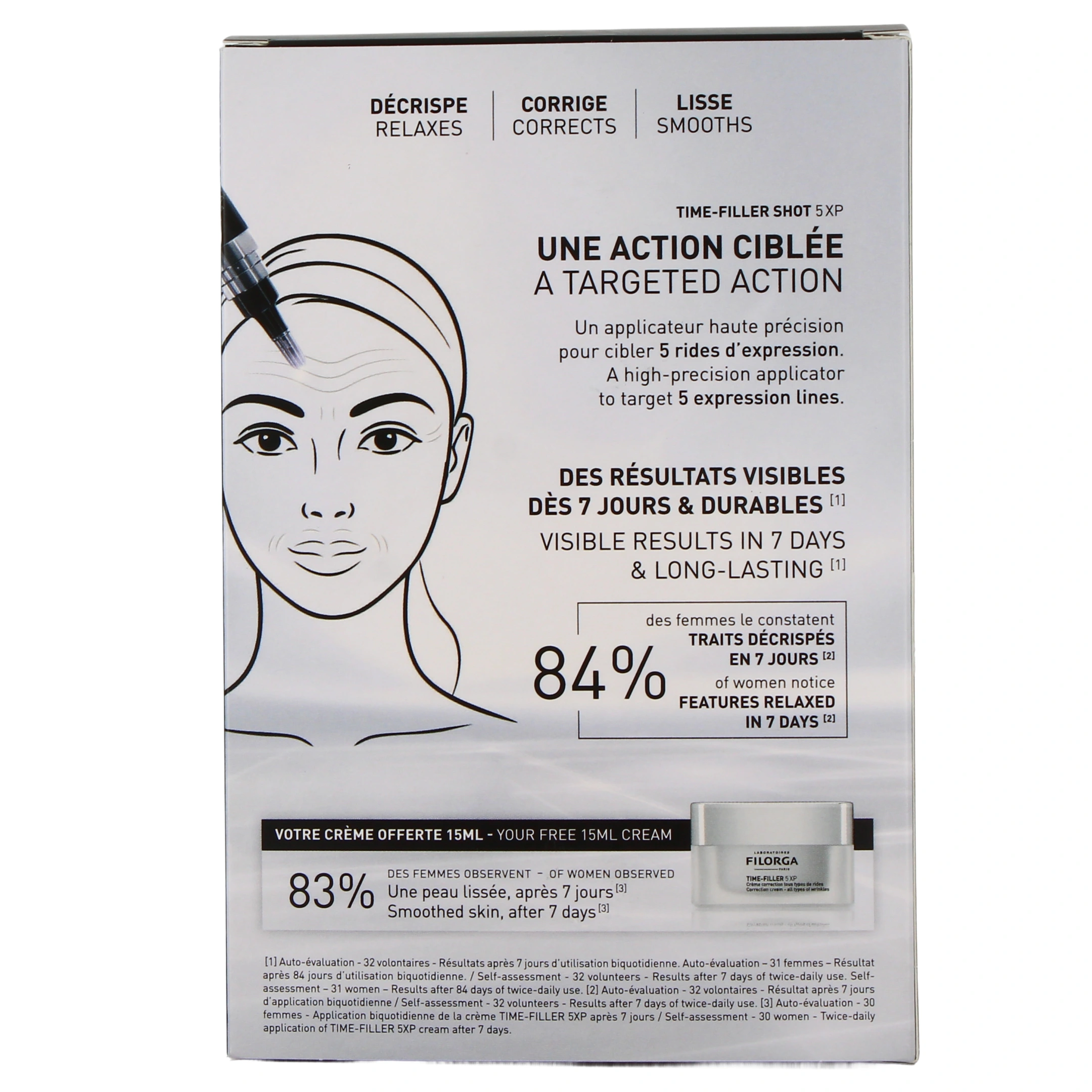 Pour lisser et combler les rides d'expression et détendre les traits du visage, le sérum Time-Filler Shot 5XP s'appuie sur une formule qui contient un actif neuropeptidique breveté, inspiré des injections de toxine botulique (botox). Il est doté d'une texture fluide étirable et d'un embout métallique qui procure un effet froid.