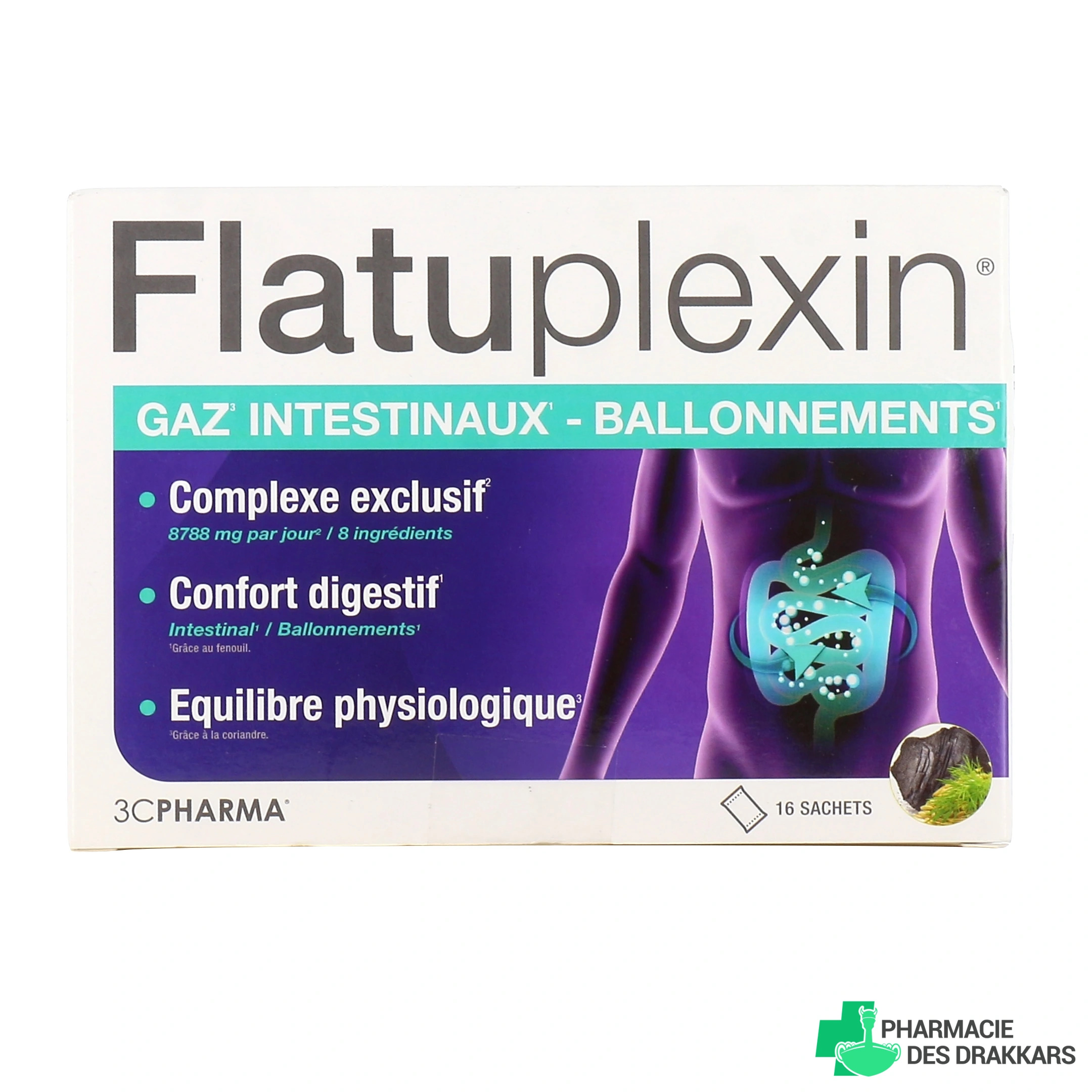 Flatuplexin Gaz Intestinaux et Ballonnements est un complément alimentaire mis au point par le laboratoire 3C Pharma pour les personnes souffrant d'inconfort digestif.