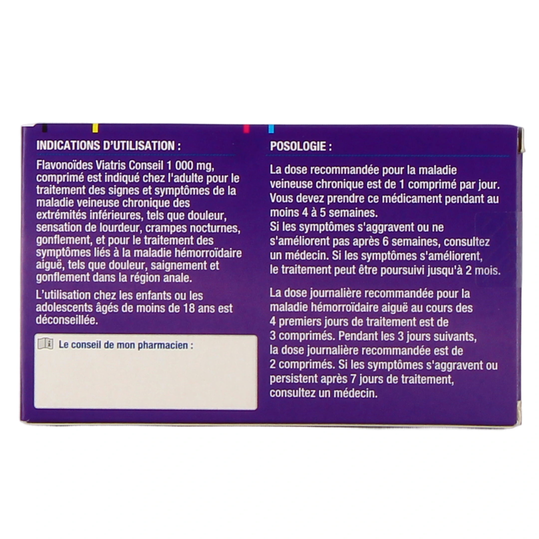 En cas de crise hémorroïdaire aiguë, vous pourrez prendre le médicament Flavonoïdes 1000 mg uniquement pendant une courte période de 7 jours. Si les symptômes n'ont pas disparu dans les 7 jours, consultez votre médecin. Si la crise s’aggrave durant le traitement (notamment si vous remarquez un saignement par le rectum, du sang dans vos selles ou si vous pensez avoir développé des hémorroïdes saignantes), consultez également votre médecin. Le traitement par Flavonoïdes ne remplace pas les autres traitements spécifiques utilisés pour d’autres maladies anales.