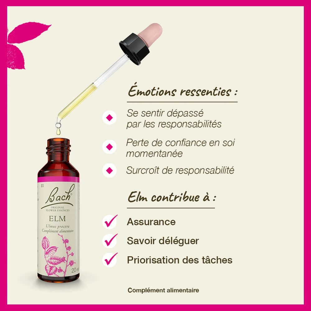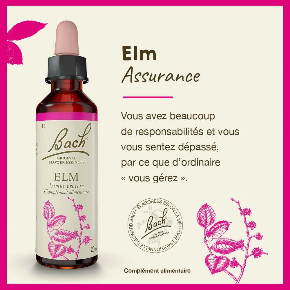 La fleur de Bach Elm aide à retrouver assurance, calme intérieur et clarté d’esprit, pour reprendre confiance en ses compétences et redéfinir ses priorités avec sérénité.