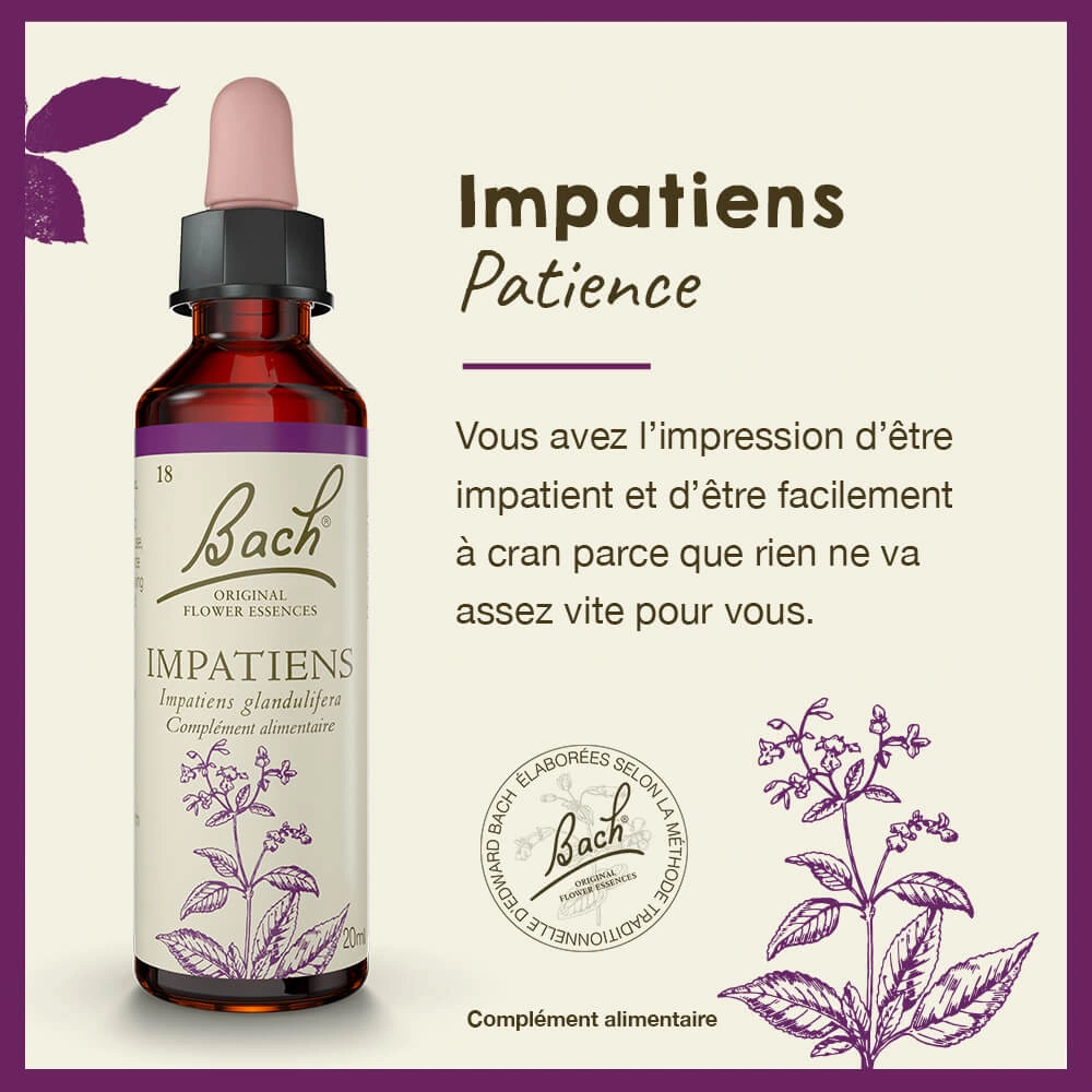 La fleur de Bach Impatiens permettrait à ces personnes d'arriver à faire preuve de plus de patience lorsqu'elles font face à des situations qui ne leur conviennent pas. Elles seraient ainsi plus à même de vivre en harmonie avec les autres.
