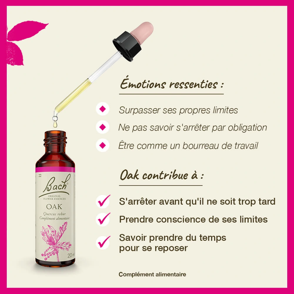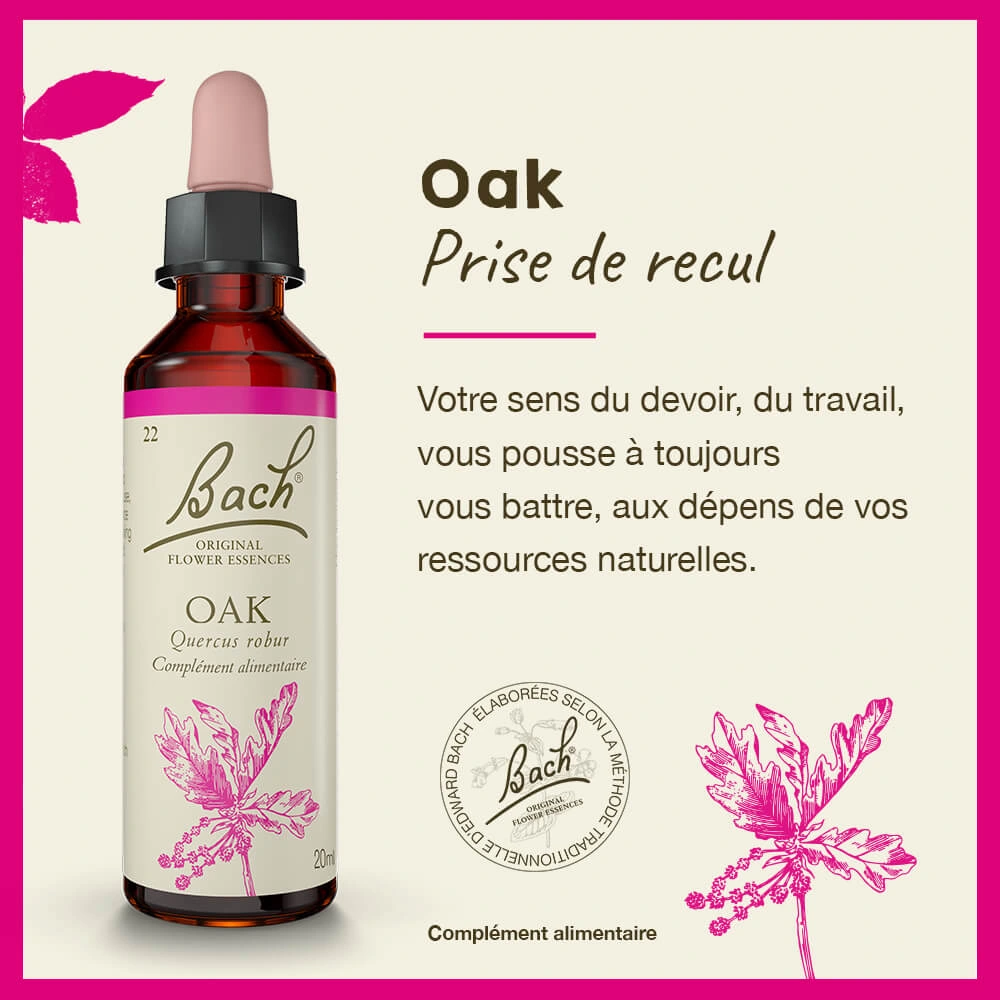 La fleur de Bach Oak aide à reconnaître ses limites sans culpabilité, à se reposer pour mieux repartir et à retrouver un équilibre entre engagement et bien-être personnel. Elle permet de conserver force et courage tout en apprenant à relâcher la pression.