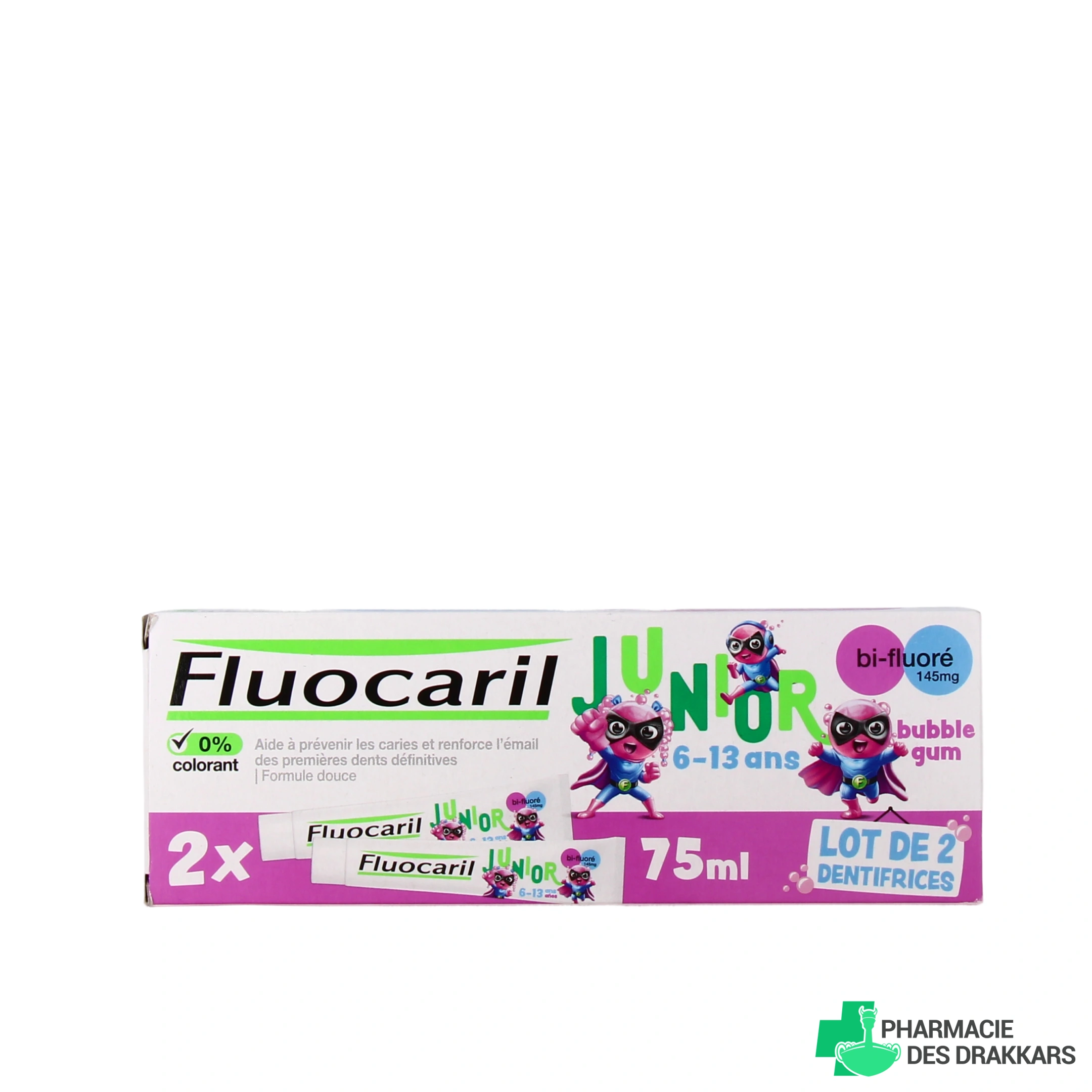 Présentations proposées par la Pharmacie des Drakkars pour le dentifrice bi-fluoré Junior 6-12 ans Fluocaril : Tube de 75ml - Lot de 2 tubes de 75ml. Parfum au choix.